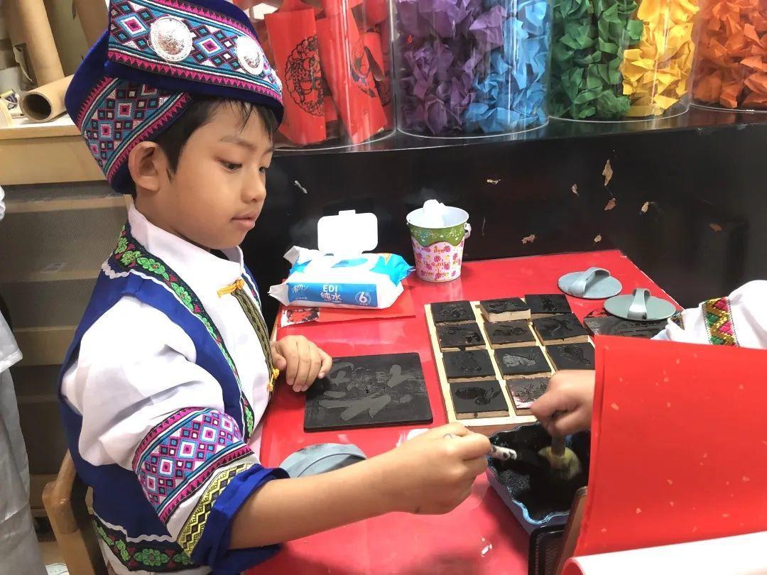 刷上颜料、覆上纸用工具拓印图案,转眼间一张张福字、一只只惟妙惟肖的兔子就制作了出来。活动现场,穿着各自民族服装的孩子们齐聚在“回幼创意美术工坊”里,一边仔细聆听老师的讲解,一边尝试文化拓印制作。在有趣的体验中,孩子们不仅了解了木板拓印的传统艺术,更在润物细无声中对民族团结有了更深的认同。