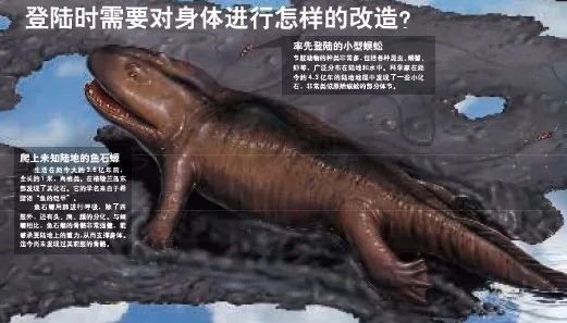 较早爬上陆地的动物之一包括鱼石螈,生活在距今约3.6亿年前,全长约1米,两栖类,在格陵兰岛东部发现其化石,它的学名来源于希腊语“鱼的铠甲”。