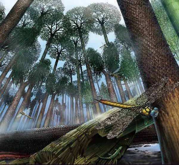 森林中,巨型蜻蜓在翩翩起舞,个头是现在中国最大的蜻蜓——巨圆臀大蜓的4~5倍;巨型蜈蚣四处爬来爬去,比成人的身高还要长。现代人要是生活其间,就像是爱丽丝梦游仙境中误喝了变小药水。