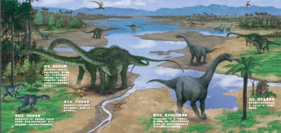 在如此得天独厚的环境中,恐龙变得越来越大,成为陆地上的统治者。异特龙是食肉恐龙,是最具代表性的兽脚类恐龙之一,体长最大可达10米以上。剑龙类及鸟脚类恐龙是食草恐龙,也是食肉恐龙的猎物,有些种类体长也可达10米以上。