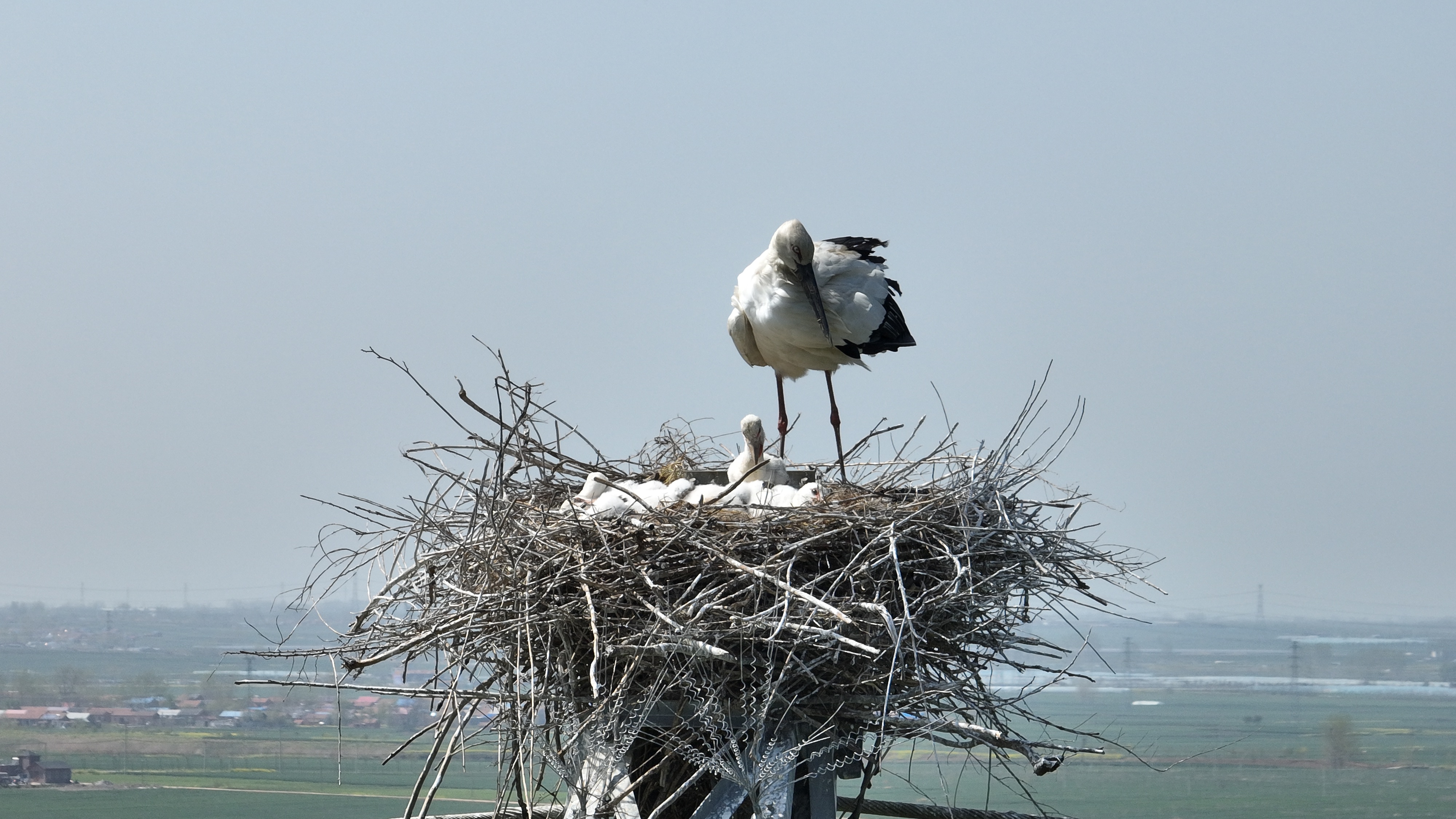 4月11日一早,通过无人机远远地观察,可以看到高高的铁塔上,东方白鹳的鸟宝宝们羽毛鲜亮,活泼可爱。小家伙们依偎在巢,毛茸茸的很是可爱,再经过一个月的成长,鹳宝宝们就要开始学习飞行了。为了保护它们能够安全生活,当地在输电铁塔的周围都安装了防护挡板,既保护了东方白鹳的安全,也让线路能够安全运行。