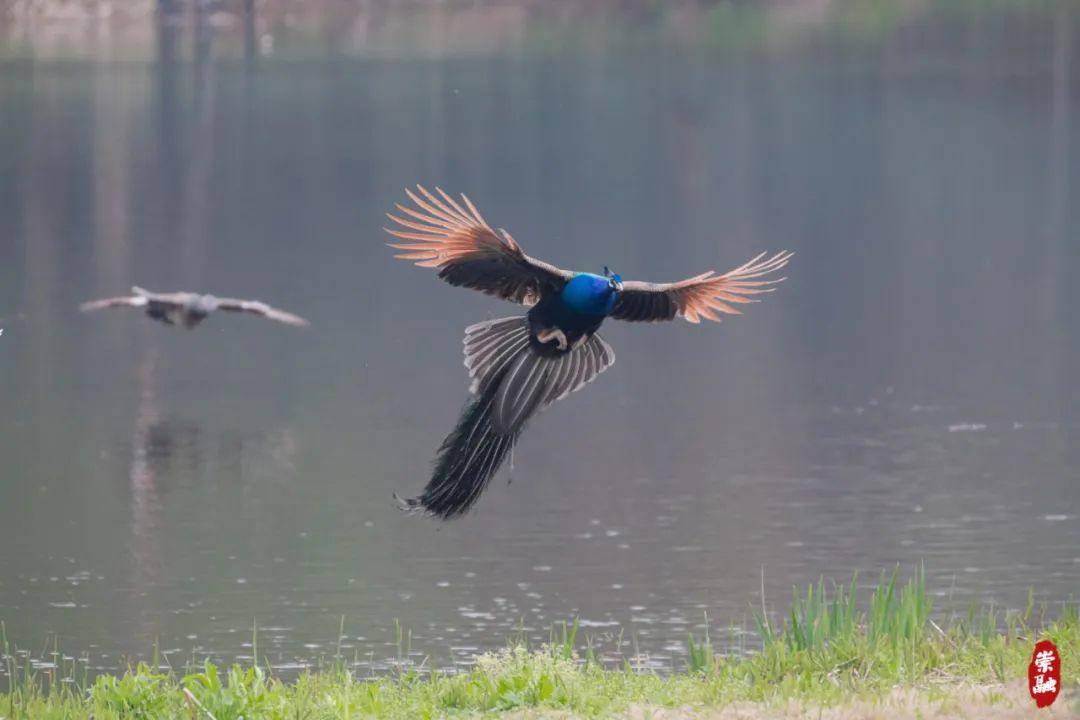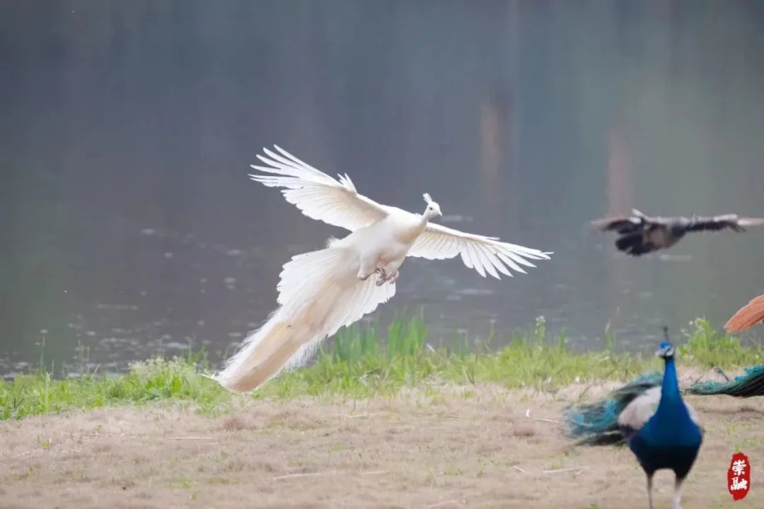 距离孔雀园百米开外的湖岸边,负责人夏玲蓉正向游客们介绍着孔雀放飞的基本情况。“大家快看,还有几分钟,马上将有100多只孔雀凌空飞来!”伴随着夏玲蓉的介绍,游客们纷纷拿出手机,准备将孔雀放飞画面定格下来。下午2点一到,夏玲蓉将一把黄灿灿的玉米撒向空中,“嘀嘀嘀”,随着婉转悠长的哨声响起,百余只孔雀展开双翅、拖着翠尾从高阁掠影而下。