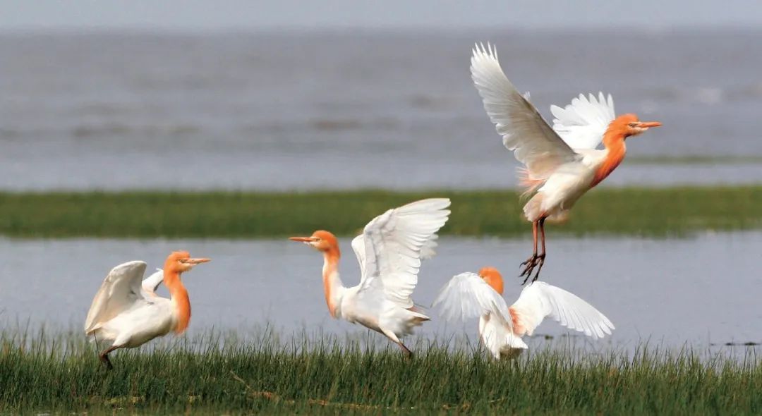 崇明岛上有众多大小不一的湖泊和水塘,吸引着众多水鸟到此捕食、栖息。