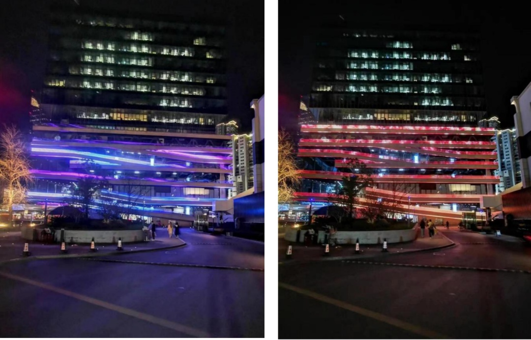 在安装的同时,灯光的调试工作也在同步进行。T20大厦车库外立面采用了多元色可变化且材质较轻的线型灯条,带来丰富的视觉体验的同时,也对灯光色彩的渐变衔接提出了更高的要求。同时,多建筑的灯光联动更是实施方案的重头戏,更需要严把细节和运筹整体视觉效果。