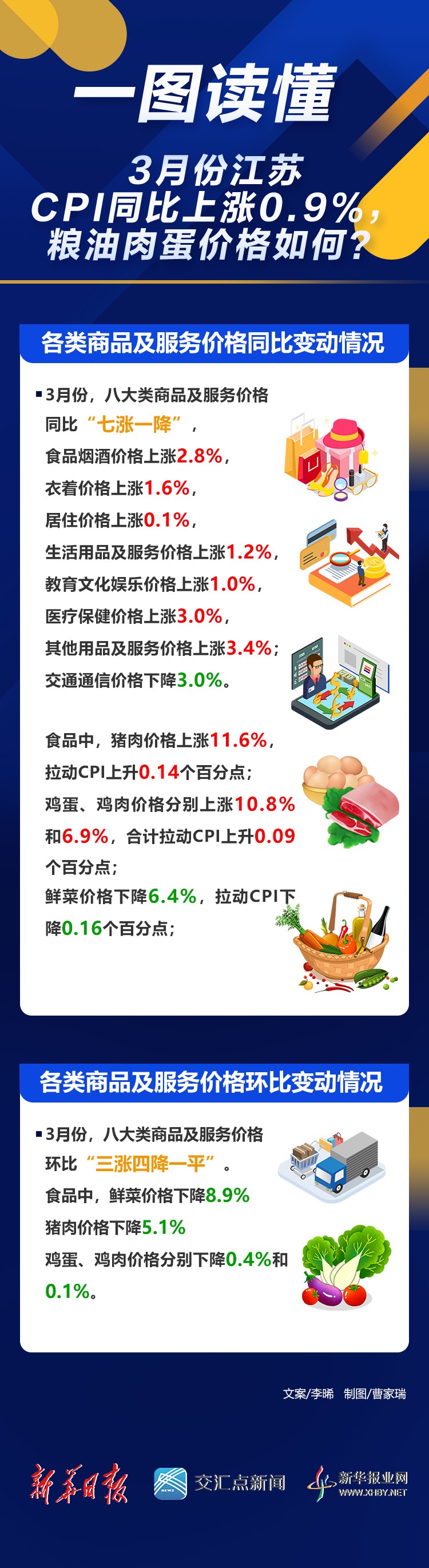交汇点讯 4月11日,国家统计局江苏调查队发布了3月份江苏居民消费价格情况。数据显示,3月份,江苏居民消费价格同比上涨0.9%。其中,城市、农村均上涨0.9%;食品价格上涨3.3%,非食品价格上涨0.4%;消费品价格上涨0.7%,服务价格上涨1.2%。1-3月,江苏居民消费价格同比上涨1.8%。