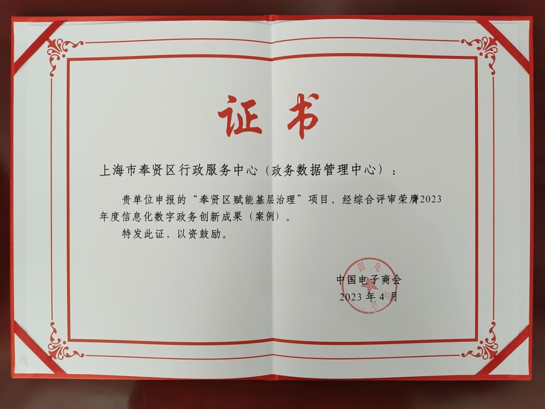 大会颁发2023年度信息化数字政务创新成果(案例),奉贤区行政服务中心(区政务数据管理中心)申报的“奉贤区赋能基层治理”项目获得此项荣誉。