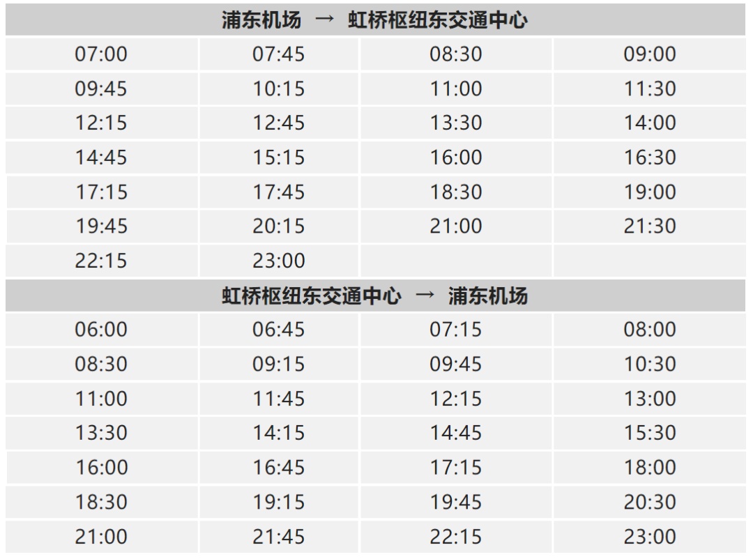 下行:浦东机场T1航站楼 → 浦东机场T2航站楼 →龙阳路芳甸路 → 世纪大道地铁站 → 延安东路浙江中路 → 延安中路华山路 → 延安西路虹许路 → 虹桥枢纽东交通中心