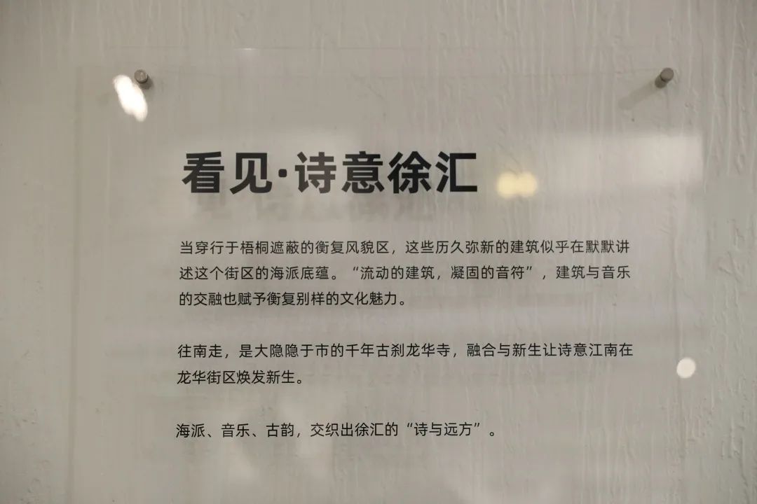 展厅墙面展示了徐汇四大文旅特色资源中魅力衡复、古韵龙华两处的图片,其中有“徐汇之美 海派之源”主题摄影展的获奖作品,也有区域内优秀历史建筑、特色空间的精美图片,通过一张张生动的影像,诠释文化与旅游的“诗与远方”。