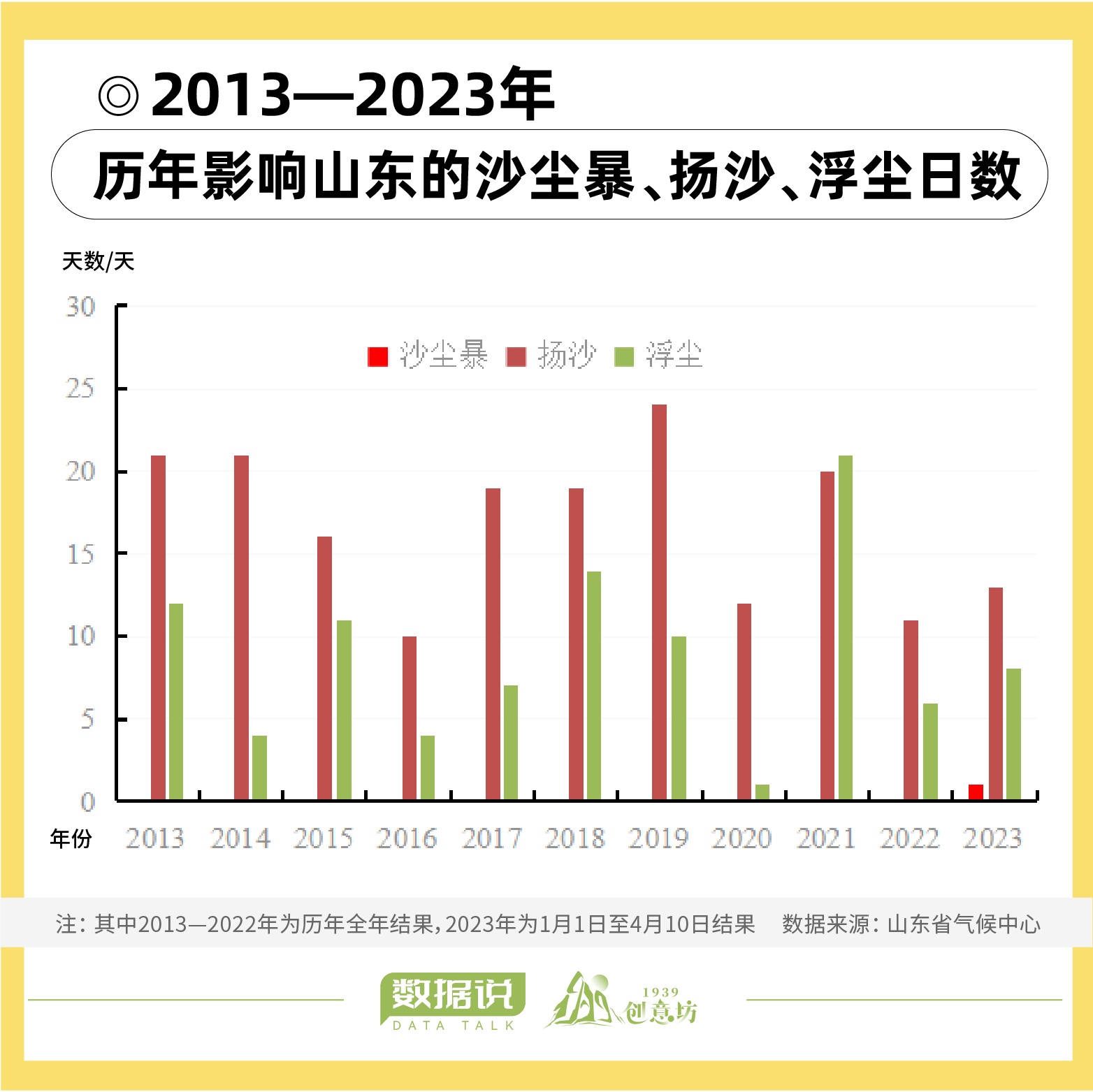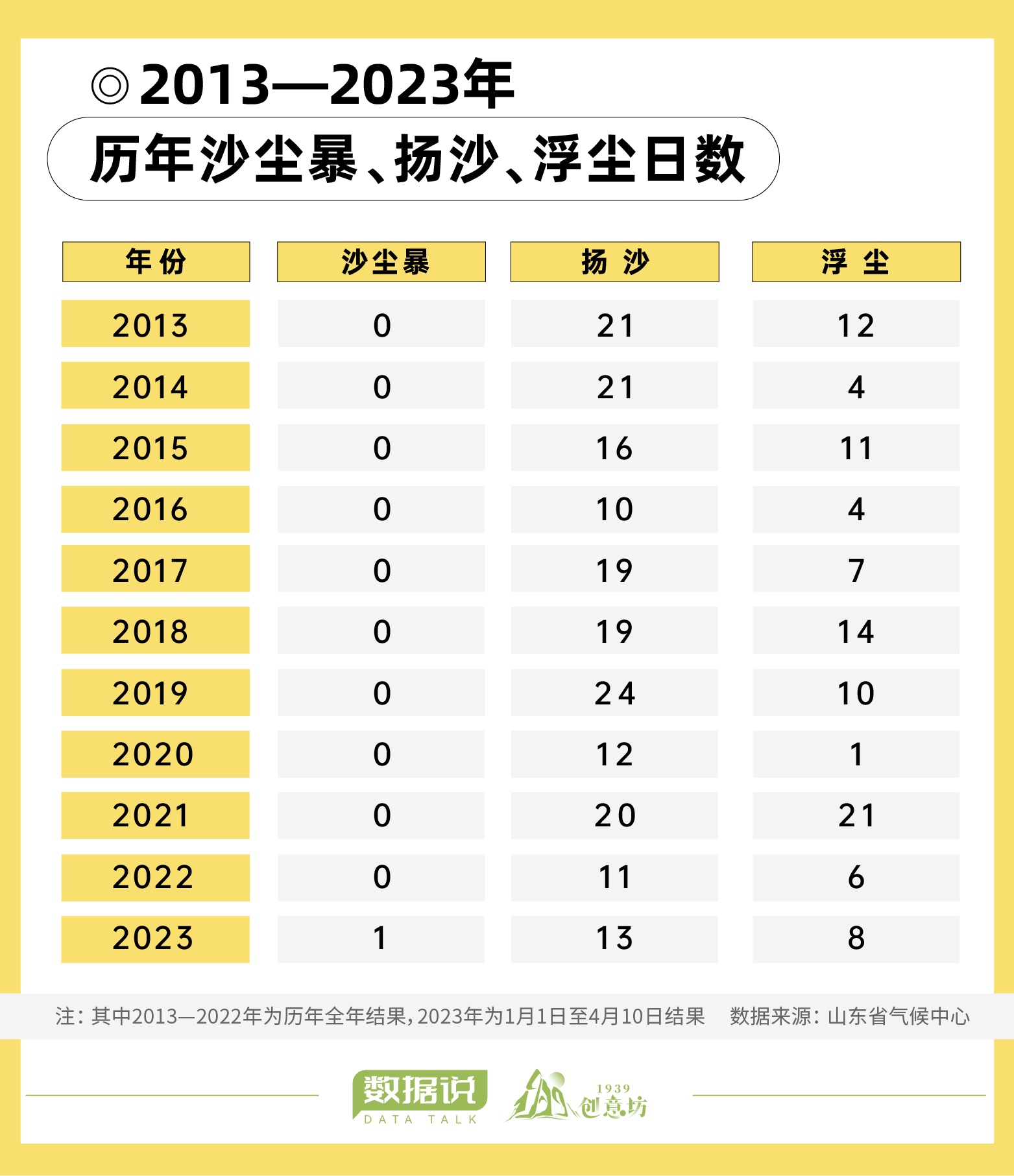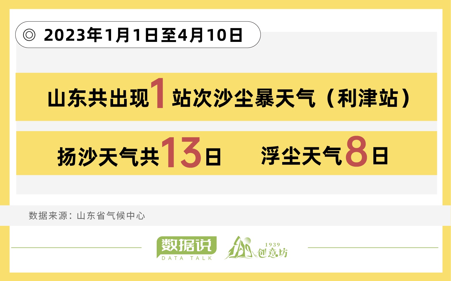 国家气象站天气现象观测记录显示,2023年1月1日至4月10日,山东共出现1站次沙尘暴天气(利津站),扬沙天气共13日,浮尘天气8日。