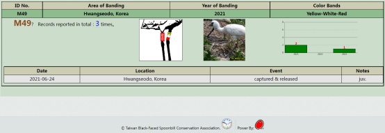 通过黑脸琵鹭保护网络(Black-faced Spoonbill Conservation Network)核实,这只黑脸琵鹭为2021年6月4日在韩国华城湿地附近被环志的个体,被环志时为幼鸟,同年9月两次都在华城湿地被观察到,随后“失踪”了一年半,直到2023年4月8日在上海九段沙湿地保护区再度被监测到。