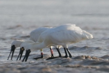 近日,九段沙湿地国家级自然保护区的工作人员在日常的鸟类调查中,共记录到国家一级重点保护野生动物黑脸琵鹭13只。其中在江亚南沙东侧观察到了6只正在一同埋头苦吃的黑脸琵鹭,场面温馨和谐。仔细察看,竟然发现其中一只左腿胫部带有自上而下黄、白、红的三色彩环,右腿胫部带有红底白字编号为M49的编码环。