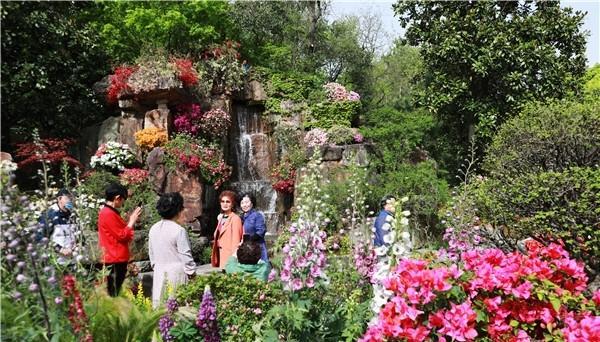 图说:杜鹃等各色花卉搭配假山瀑布营造的景观吸引了不少市民拍照留影