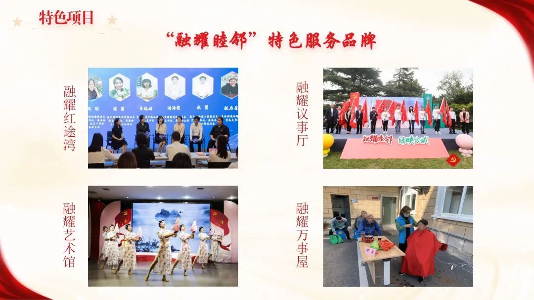 在街道中心层面,形成了“融耀睦邻”特色服务品牌。“融耀红途湾”以学习教育为主,通过开展形式多样的党课,进一步强化党员身份和党性修养;“融耀议事厅”搭建沟通交流,议事商讨的平台,专注于全过程人民民主;“融耀艺术馆”通过书画、手工体验、舞蹈、唱演等形式不断丰富党员群众的文化生活;“融耀万事屋”以为民、便民、利民为宗旨,提供生活上、精神上、工作上所需要的帮助。