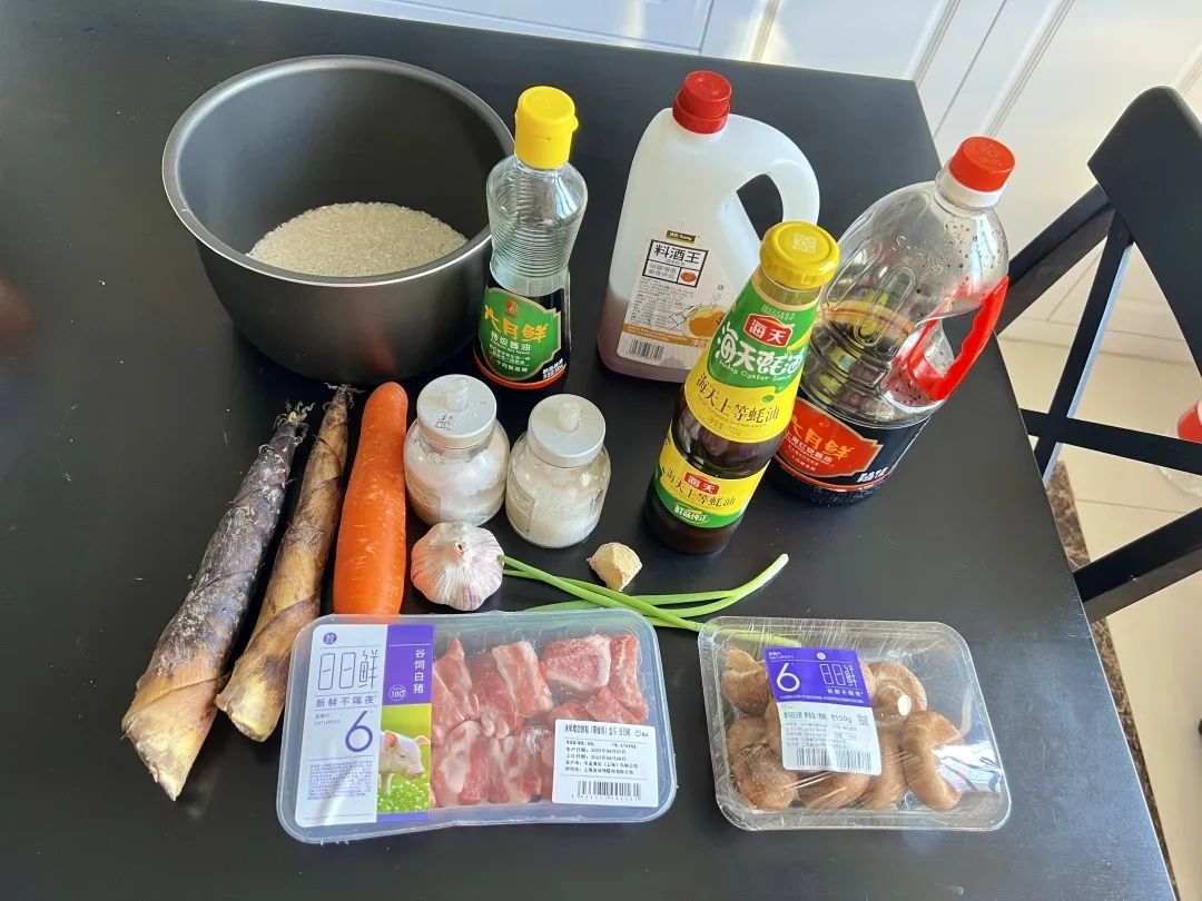食材:大米、排骨、春笋、胡萝卜、香菇、姜、蒜、葱、老抽、生抽、料酒、蚝油、盐、白砂糖