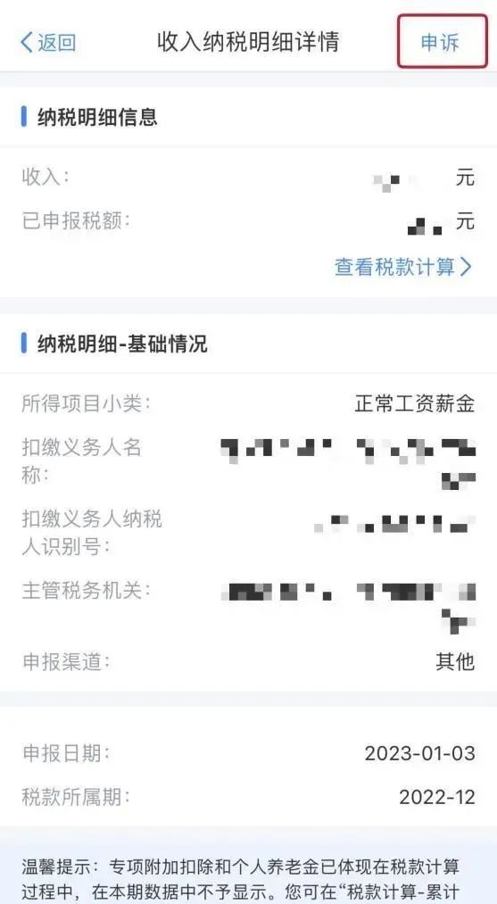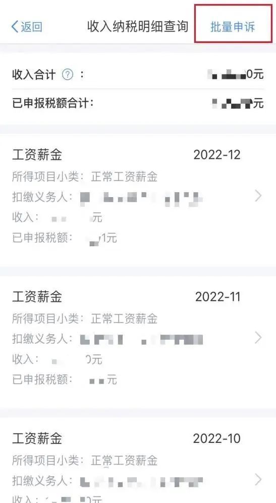 当您发现收入和纳税明细存在问题时,可以选择对某条或某些不实收入进行“申诉”或“批量申诉”处理。