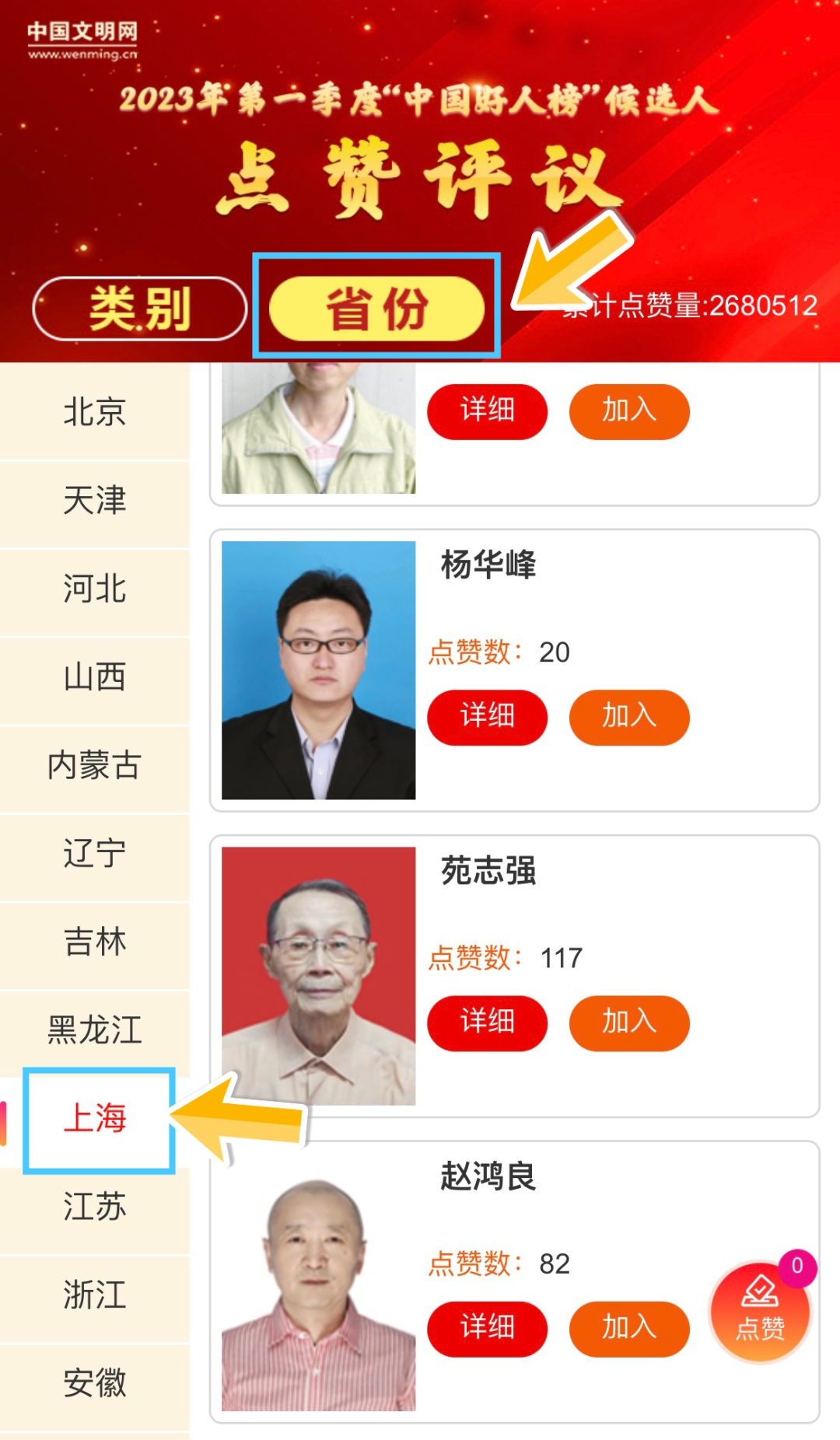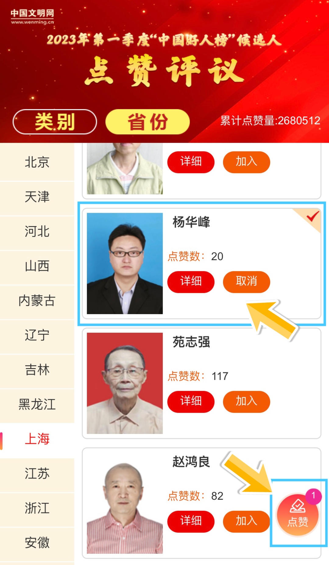 接着,在相应候选人下方点击“加入”,点击页面右下方红色按钮“点赞”