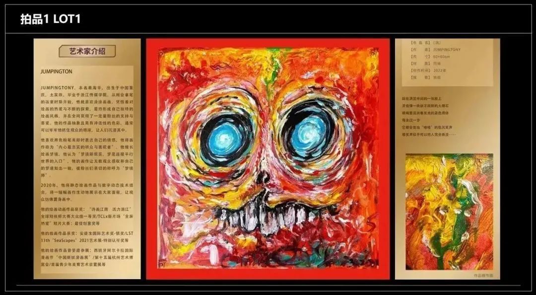 “艺术从来不限于工具与材料,人工智能、元宇宙的诞生智慧给艺术家带来更多便利,模糊了界限带来更多的灵感”青年艺术家JUMPINGTONY分享说。JUMPINGTONY擅长绘画梦境,被粉丝们亲切的称呼为“梦境师”。他的作品抽象且具有冲击性的色彩,以梦幻般的抽象色彩牢牢地抓住观众的眼球,让人们沉浸其中。由他创作的《涡》和《麦》此次也进行了数字化确权,参与了拍卖。