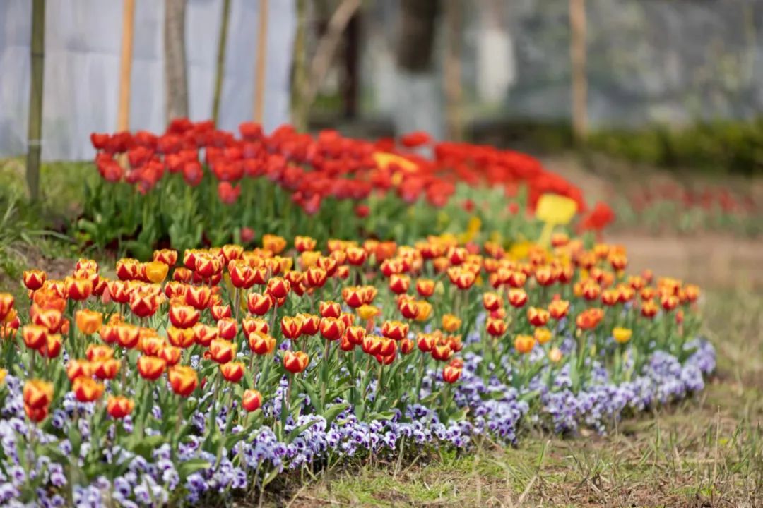 此外,色彩缤纷的郁金香、紫色二月兰花海、玫红三角梅瀑布花海、金黄油菜花海、花香沁鼻的五彩水仙、库肯霍夫花径小溪及滨水花海连绵绽放,营造出万紫千红的炫彩幻美意境。