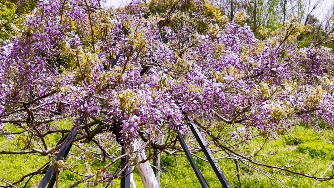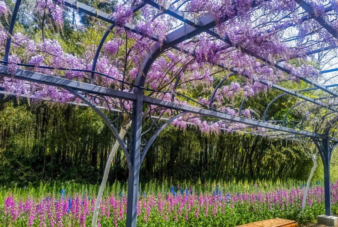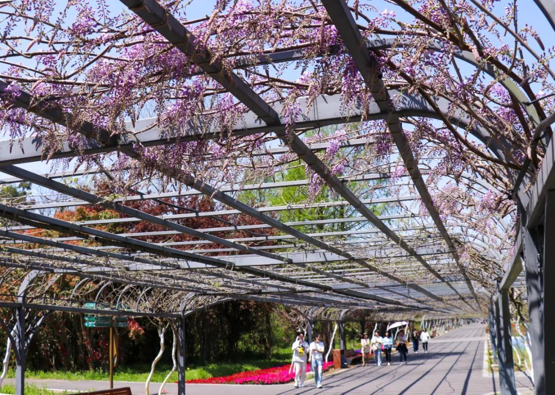 东平国家森林公园内千米紫藤长廊,是目前长三角地区单体最长的紫藤长廊。如今长穗花紫藤已进入观赏期,花穗形态多变,花色艳丽动人,千米叠层垂挂,形成一帘幽梦的花海花廊景象。