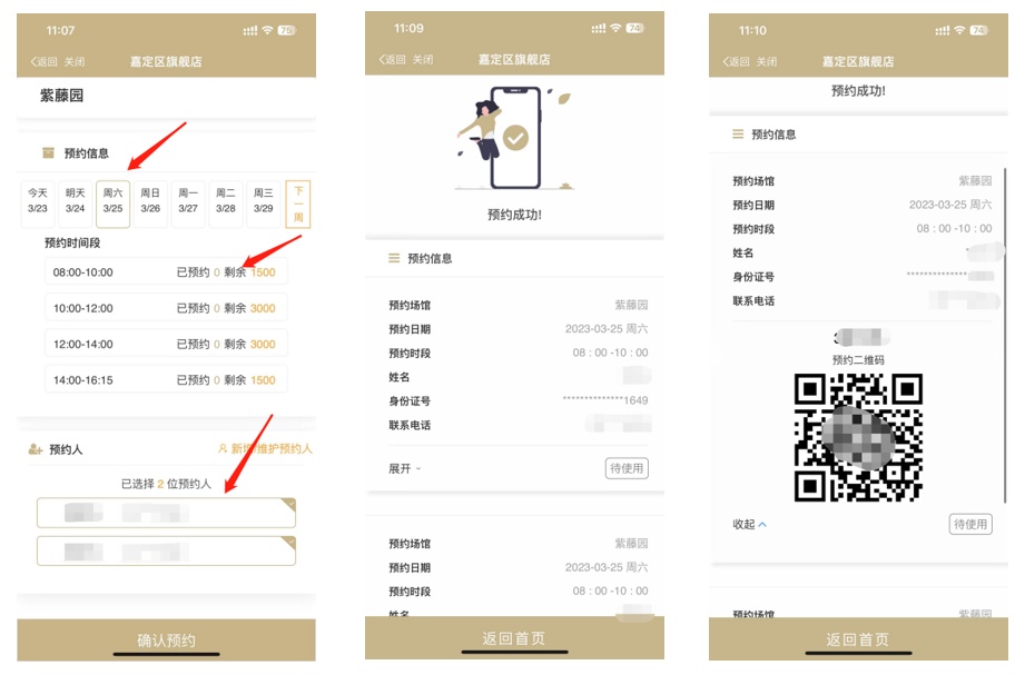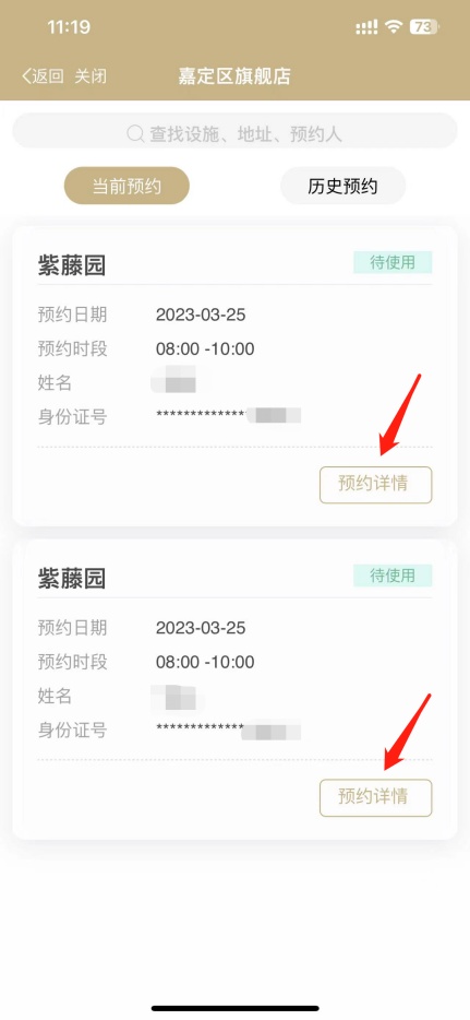 打开“上海嘉定”APP、“上海嘉定”微信公众号,“随申办”APP、微信或支付宝小程序进入嘉定旗舰店,进入“公园预约”应用→“我的预约”→“预约详情”(可提前截图备用),现场出示“预约码”核销。