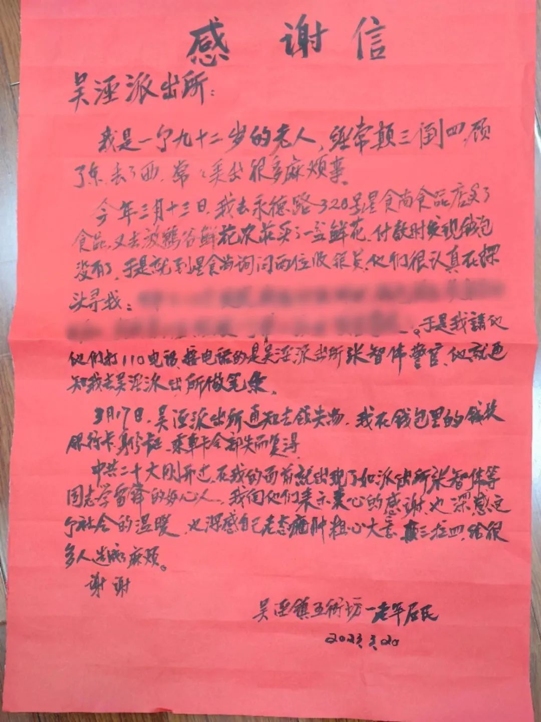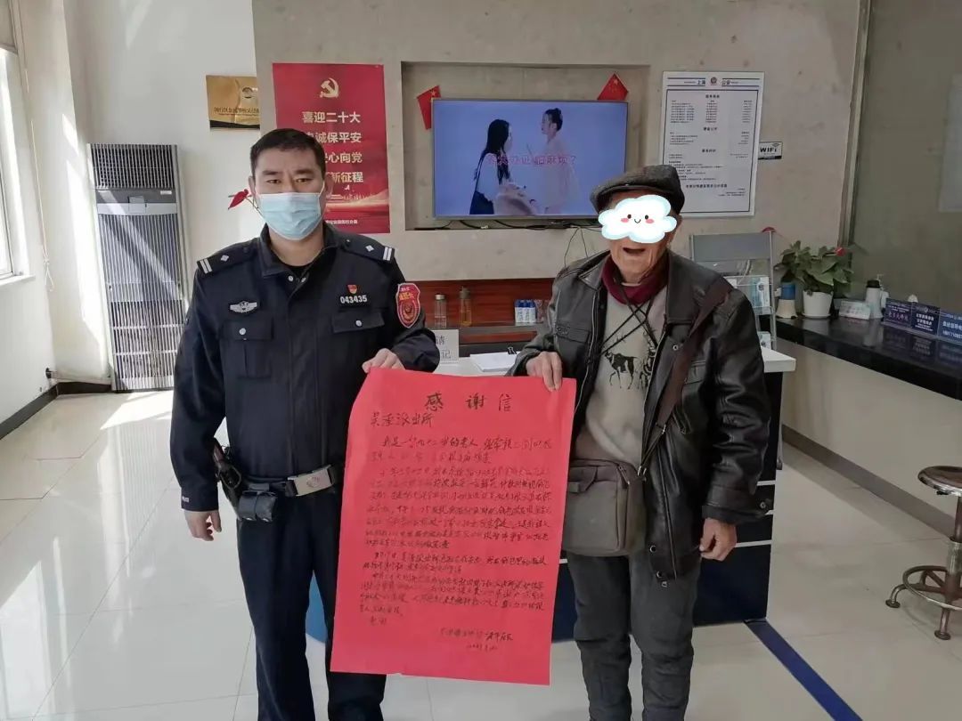 公共视频画面中只能看到一名拿走钱包的黑衣女子的身体,无法看清脸部。于是民警扩大搜索范围,终于联系上了捡到钱包的黑衣女子。接到民警电话后,女子称捡到钱包后正不知如何处理,愿意将钱包送到派出所,民警随后通知徐老伯到所领回钱包。钱包失而复得,徐老伯非常高兴。为表示对民警的感谢,在家思量几日后,特地找来一张大红纸,在上面写了一封表扬信,“我自己弄丢了,还要麻烦人家,人家帮我一门心思去找,不是能够轻易找到的,所以很感激。”