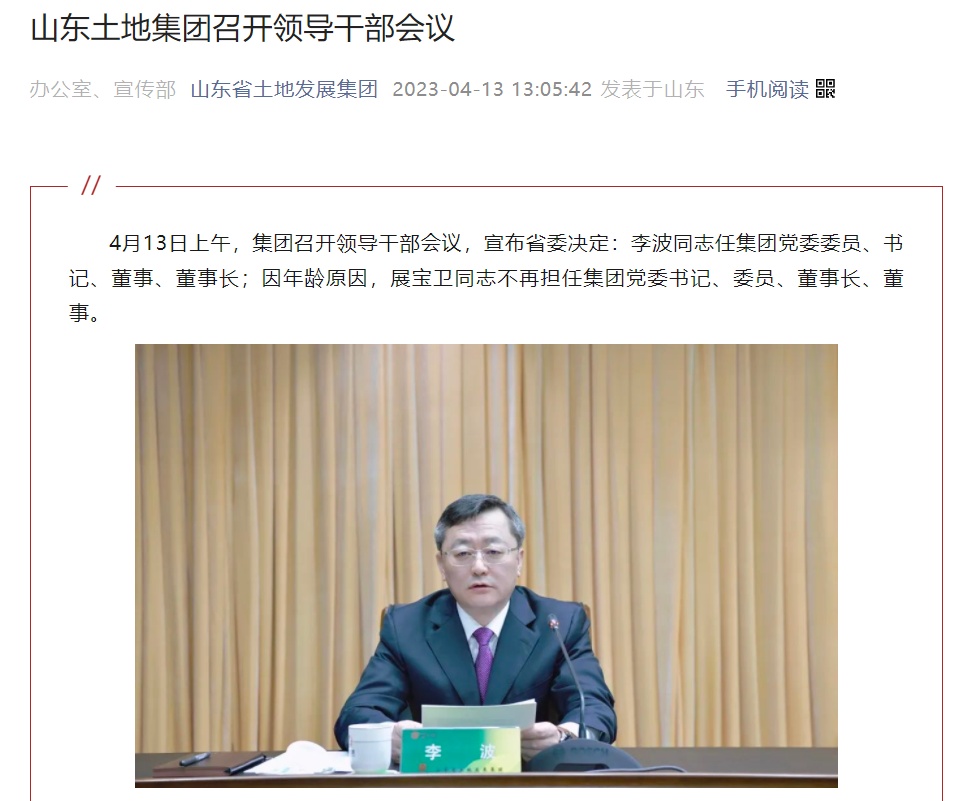 4月13日上午,山东省土地发展集团召开领导干部会议,宣布省委决定:李波同志任集团党委委员、书记、董事、董事长;因年龄原因,展宝卫同志不再担任集团党委书记、委员、董事长、董事。