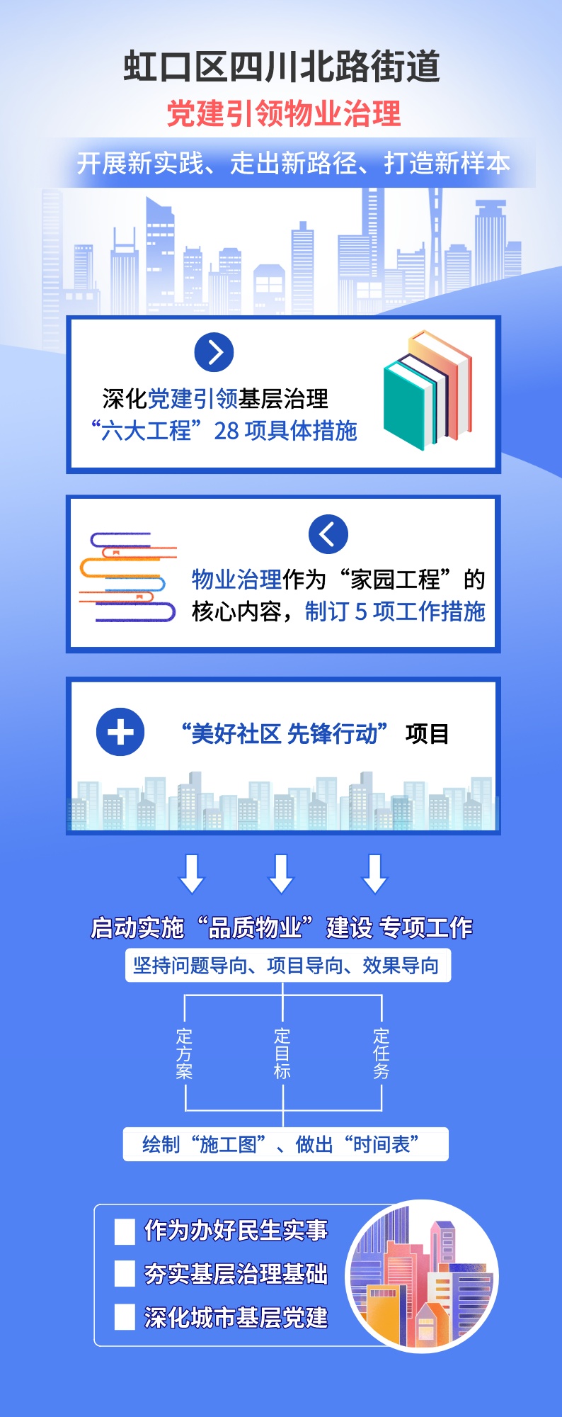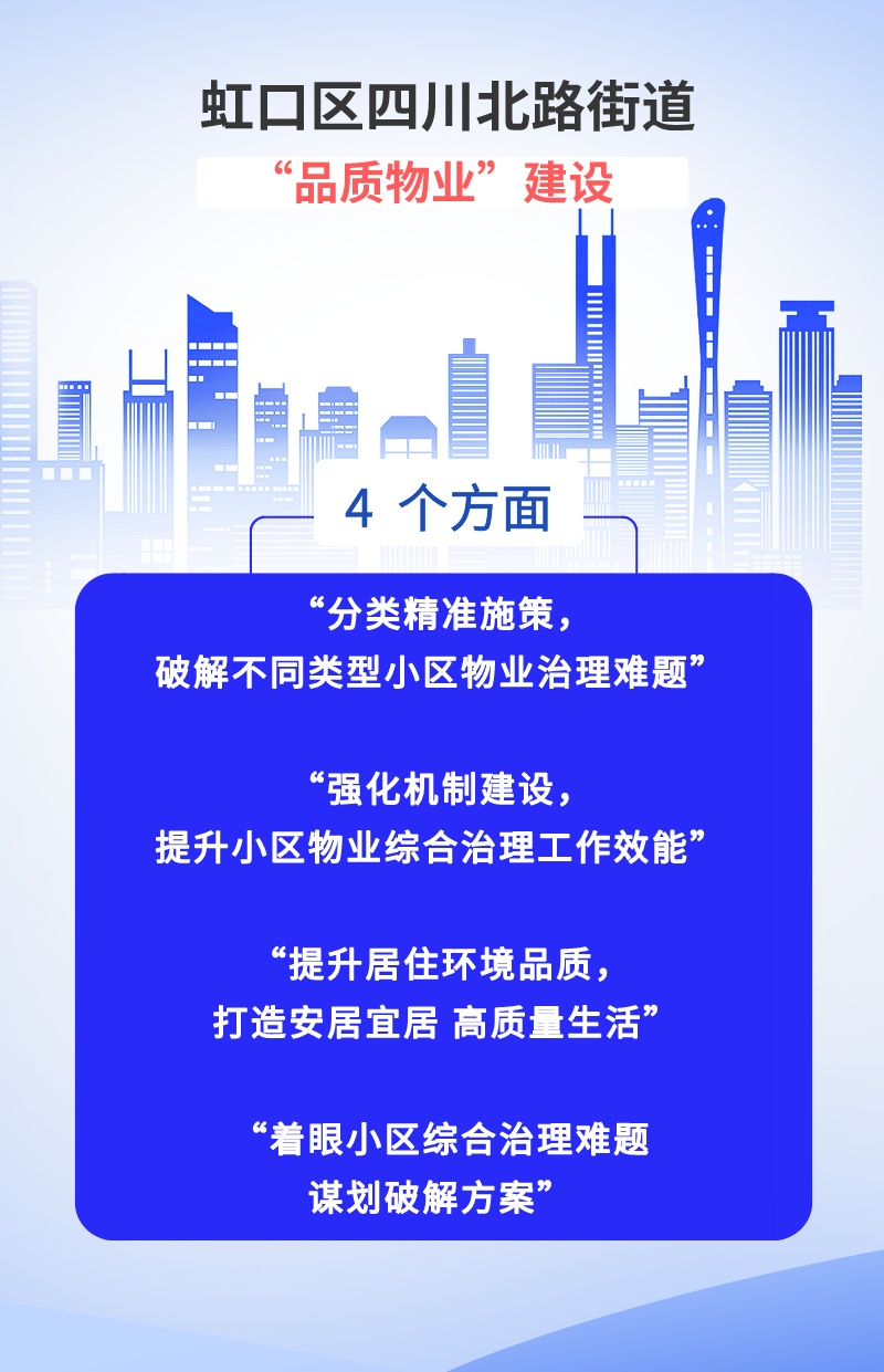 近年来,四川北路街道深化党建引领基层治理“六大工程”28项具体措施,将物业治理作为“家园工程”的核心内容,制订了5项工作措施,并进一步启动实施“品质物业”建设专项工作。