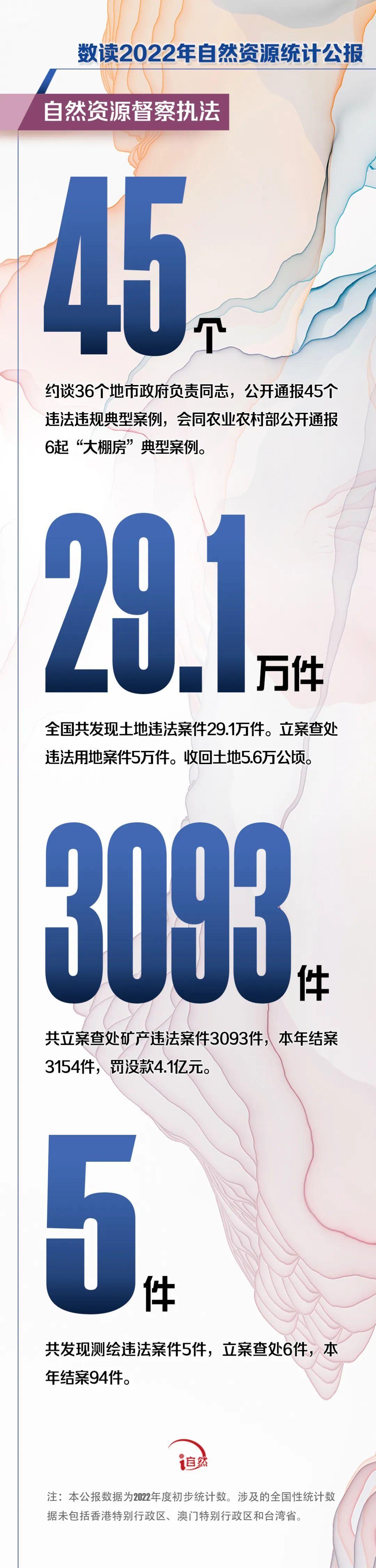 《公报》显示,在自然资源督察执法方面,2022年,全国共立案查处土地违法用地案件5.0万件,涉及土地面积3.3万公顷,同比分别下降40.0%和68.6%;共立案查处矿产违法案件3093件,同比下降21.9%。