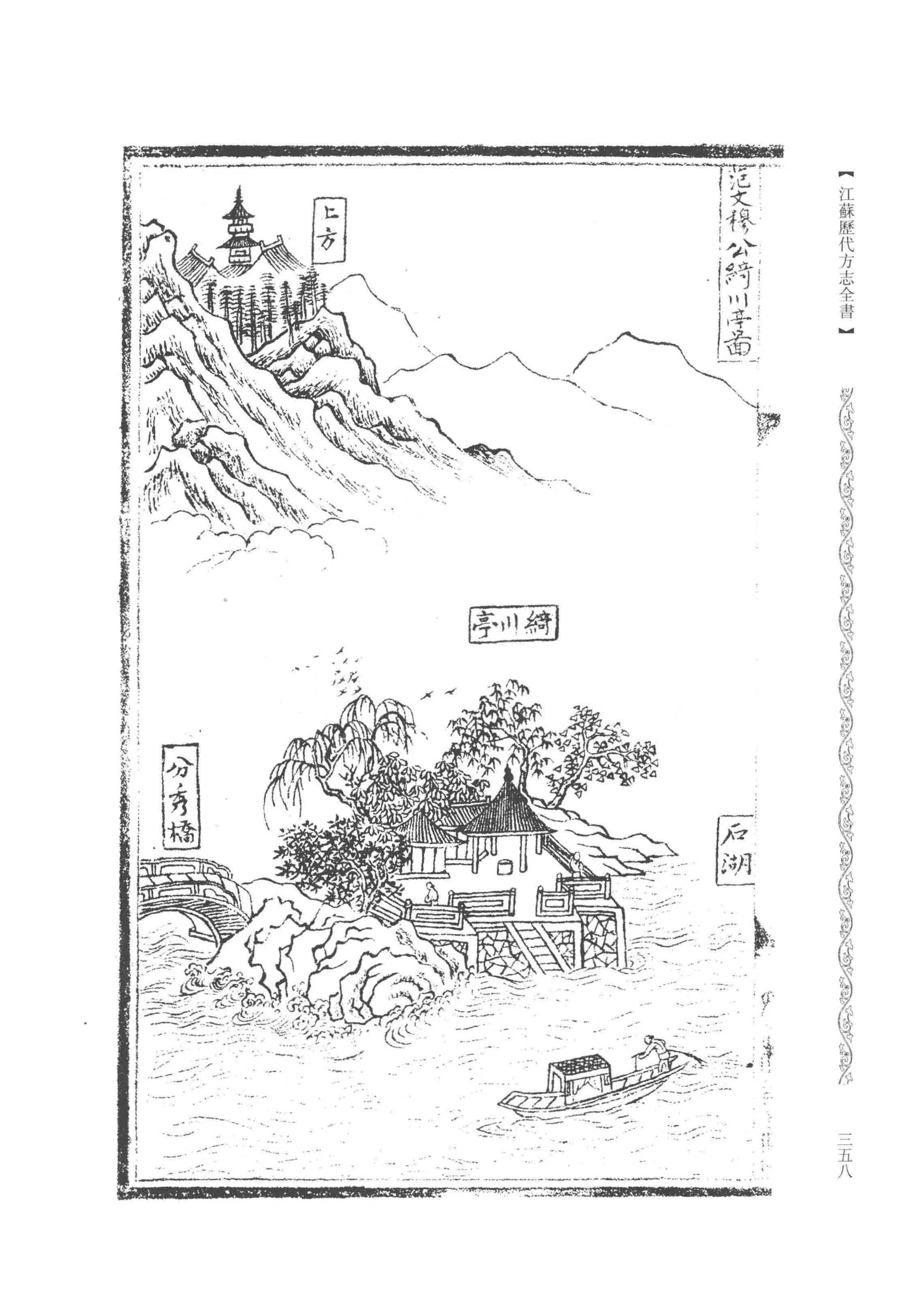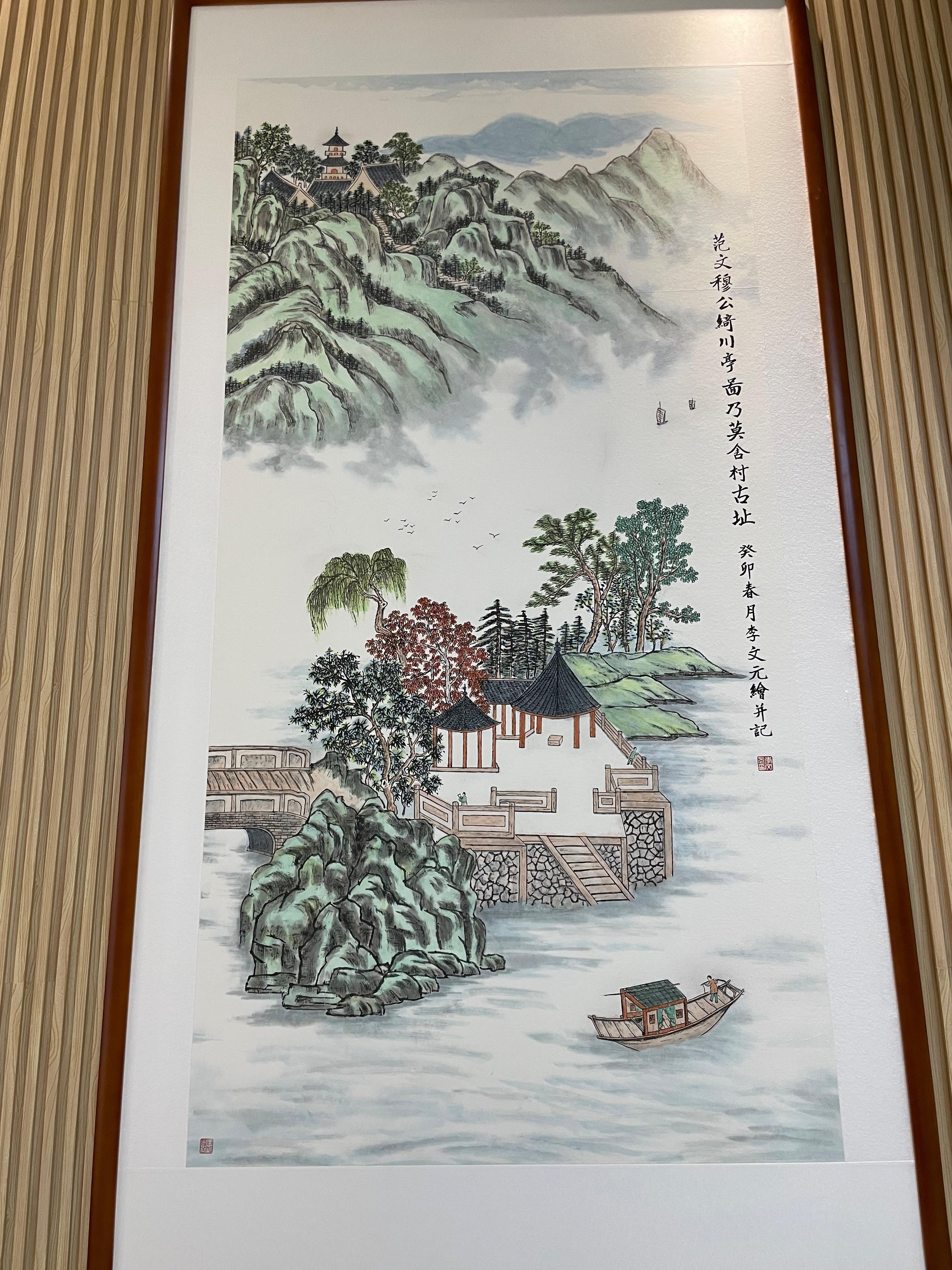 如今,村子整体拆迁成了社区,为了让大家记住来时路,社区于2022年邀请当地老党员、书画家李文元,仿绘莫舍先贤、明代文人莫旦所著《弘治吴江志》中的《范文穆公绮川亭图》,悬挂在位于社区中心的综合为老服务中心。图上一行小字,“范文穆公绮川亭图乃莫舍村古址”。往来的居民们经常到这里,观看画上山水为景,烟火关情,遥想祖辈发愤苦读、编修志书的往事,遥远的历史仿佛一下子拉近了距离,千年百载的石湖记忆好像也有了温度。