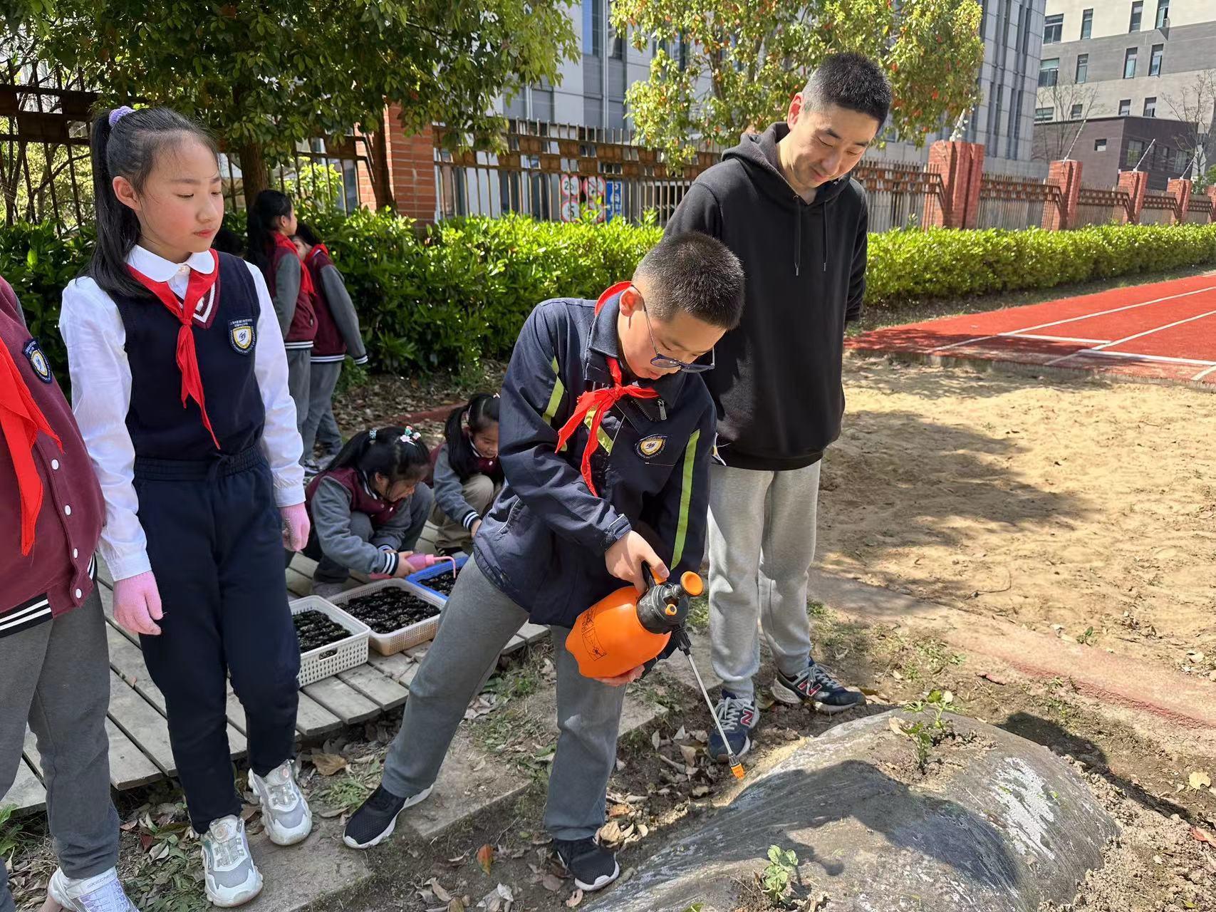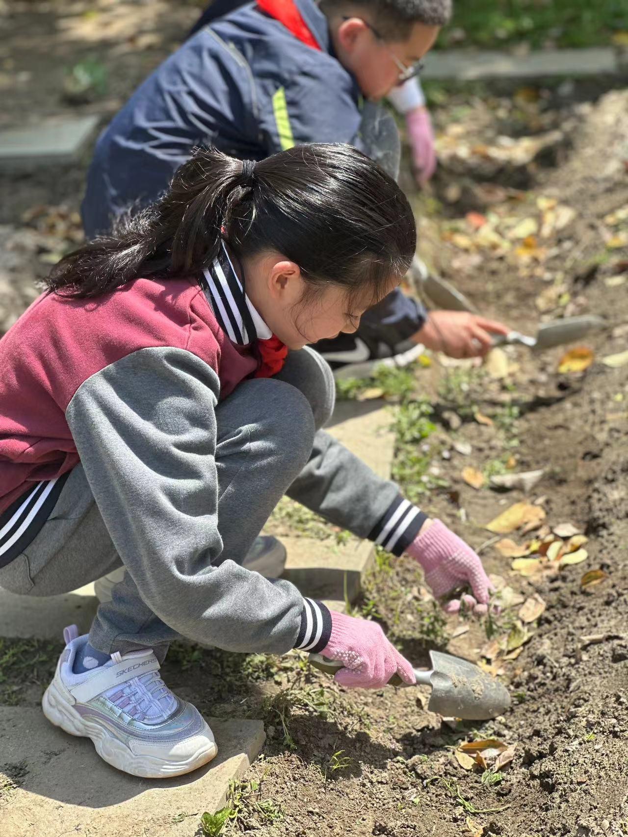 锄地、放苗、浇水、拔草、施肥……热情高涨的孩子们纷纷卷起袖子,抡起铲子,拎起水壶,在刘老师和种植顾问王师傅地指导下有条不紊地开心劳作,干得热火朝天!