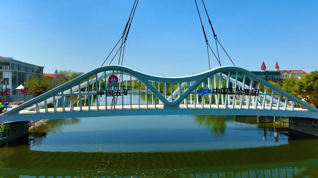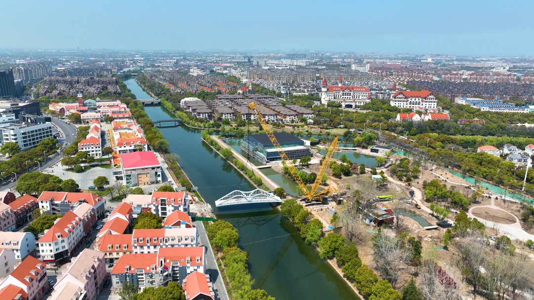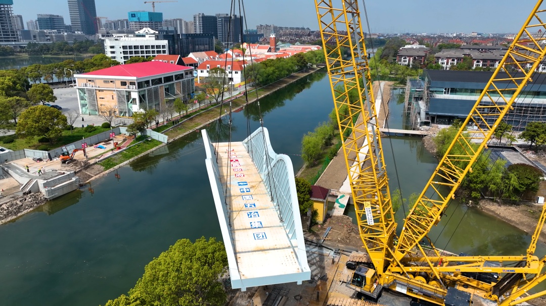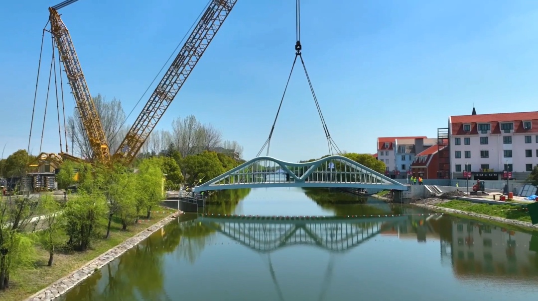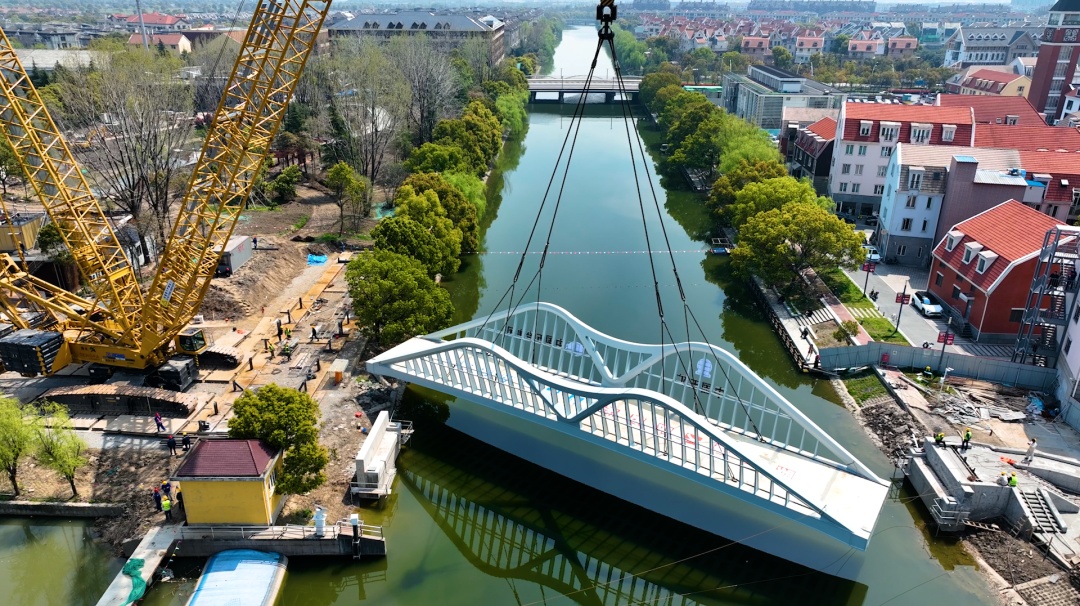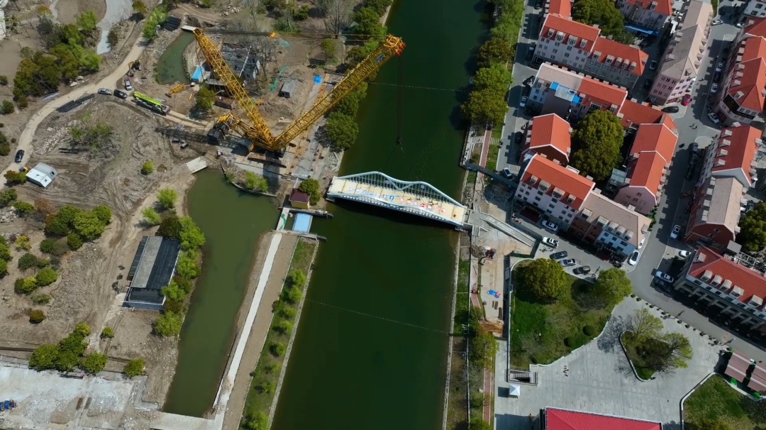 近日,随着桥梁主体精准落位,标志着宝山区罗店镇诺贝尔科技公园配套人行桥顺利完成吊装。