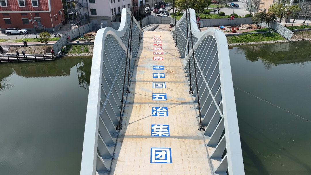 施工现场一些工人在钢结构桥梁上进行焊接作业,龙门大吊车开足马力,井然有序实施吊装,现场呈现一派热闹的工作景象。一座跨径42米、宽6.856米、重达192吨单跨梁拱组合钢结构桥梁被吊车徐徐吊起,又稳稳地架设桥梁支座上,整座桥体造型新颖,犹如展翅腾飞的雄鹰,栩栩如生。