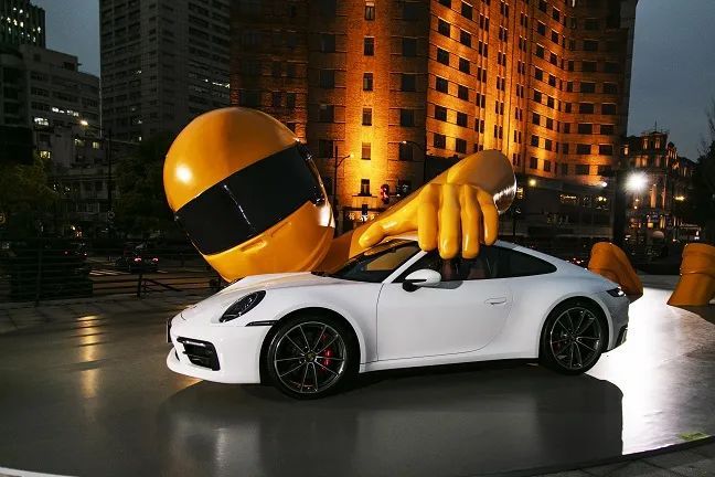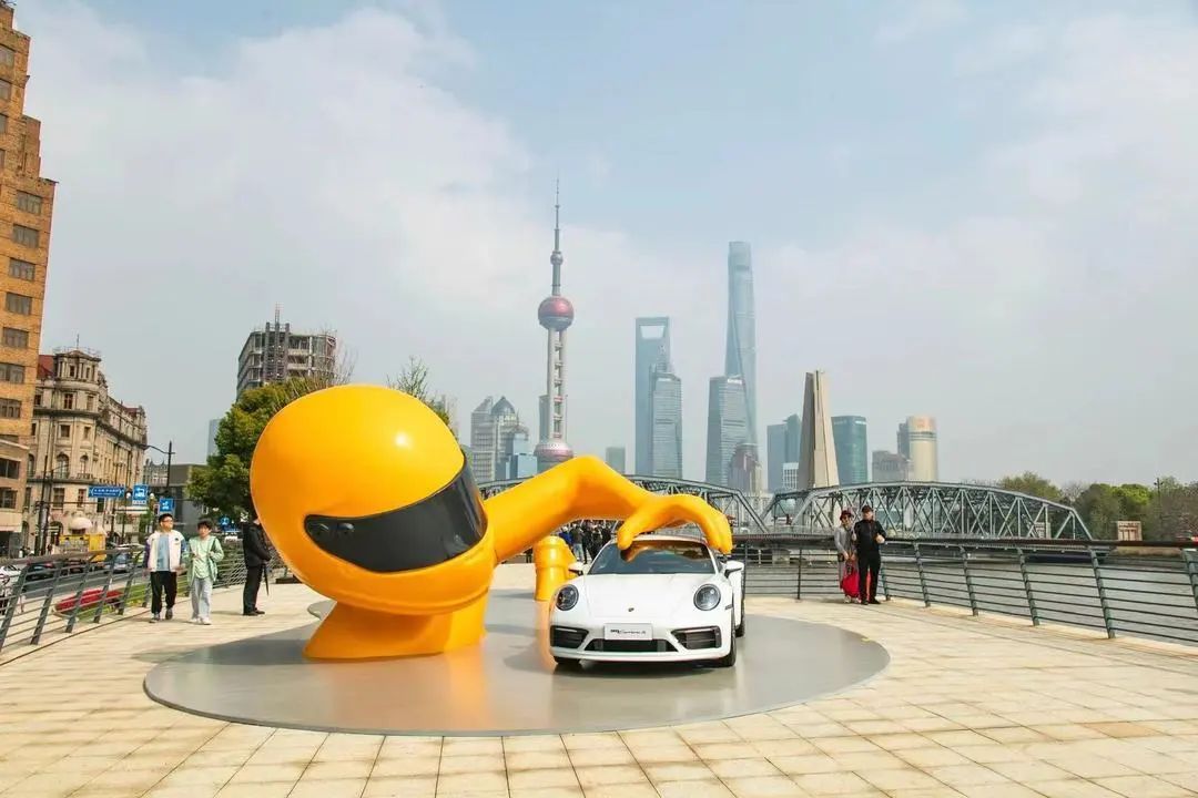 一个戴着赛车手头盔的“黄色巨人”破地而出,“抓”住一辆白色的保时捷911 Carrera S跑车,引得路人纷纷驻足观赏,拍照打卡。