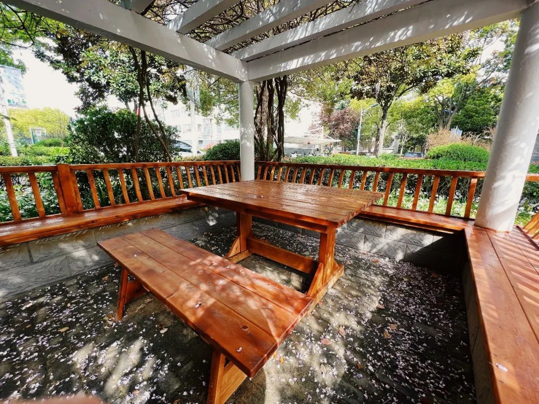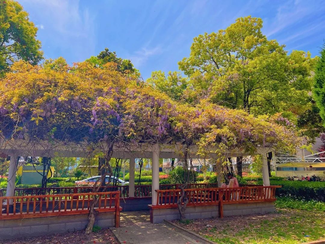 4月13日一早,小编来到柘林镇乐怡苑的“怡事亭”看到,重新刷漆、整修的柱子外立面,新增的防腐木护栏、木桌、休闲椅,新铺设的长椅底座木板,浅紫色的紫藤花如流苏般轻柔垂下,把凉亭装扮得诗情画意,春意盎然。