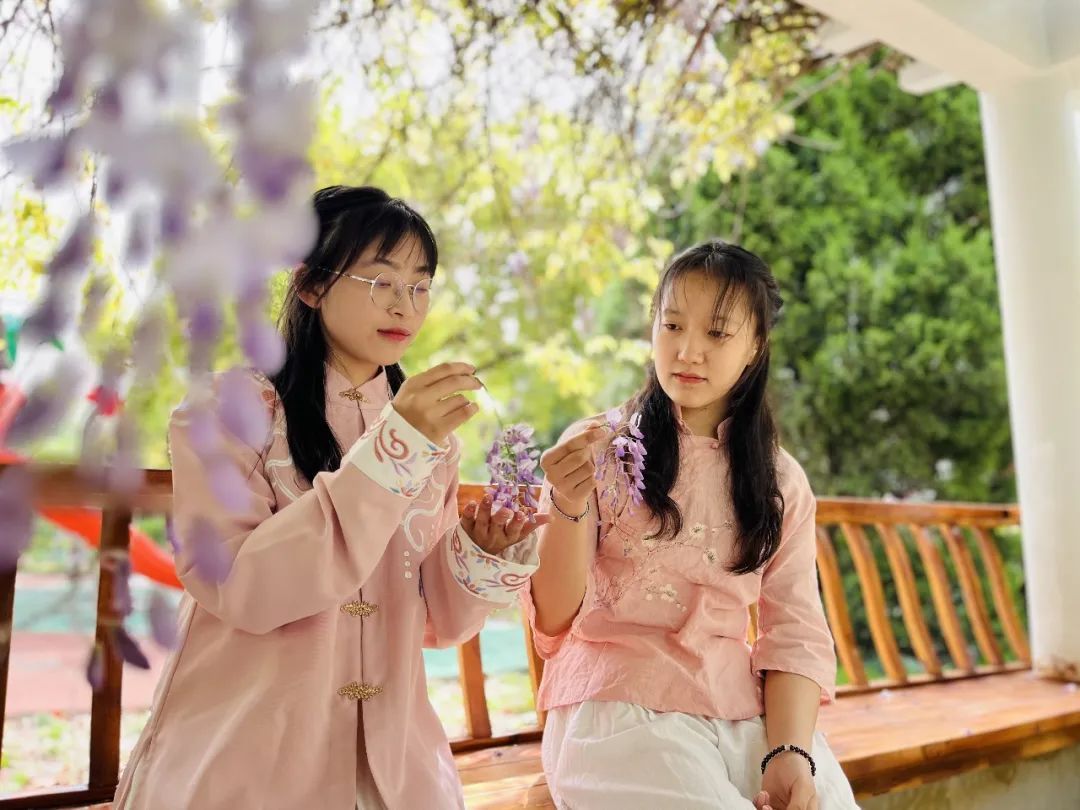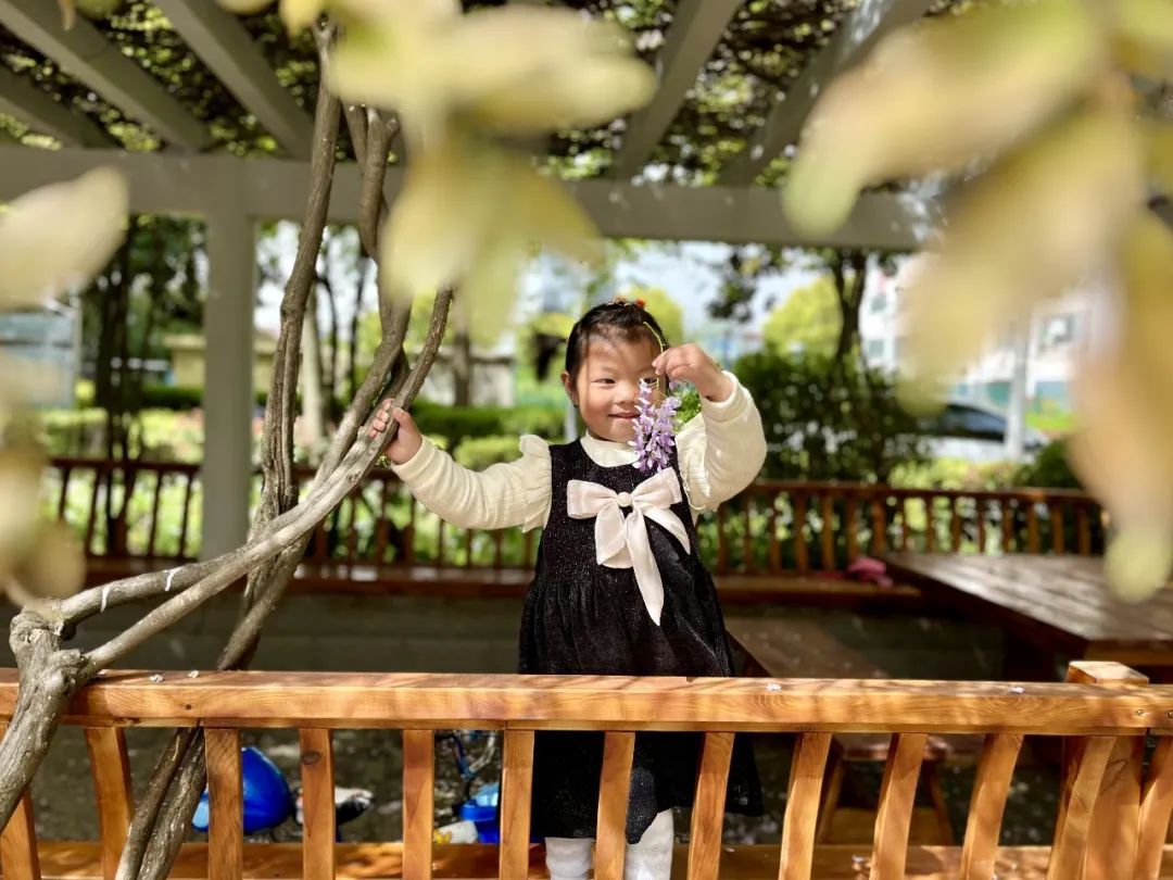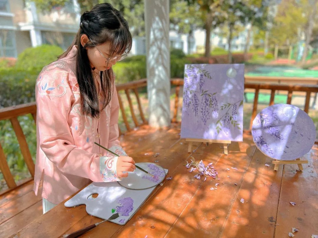 走进怡事亭,居民们正在开展“海韵治汇”系列活动——“春日寻景,静心留迹”主题活动,他们拿着手中的画笔将垂落下的紫藤花描绘下来,并与紫藤花拍照留念。