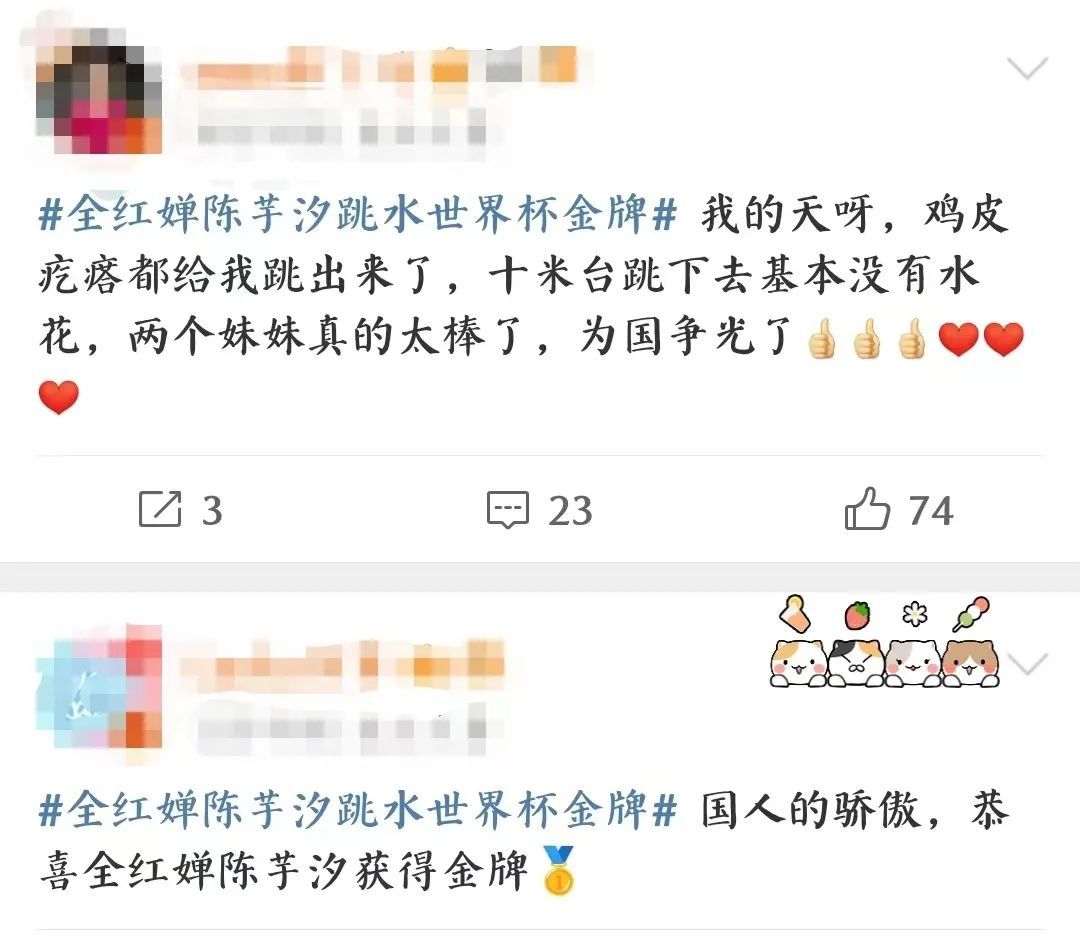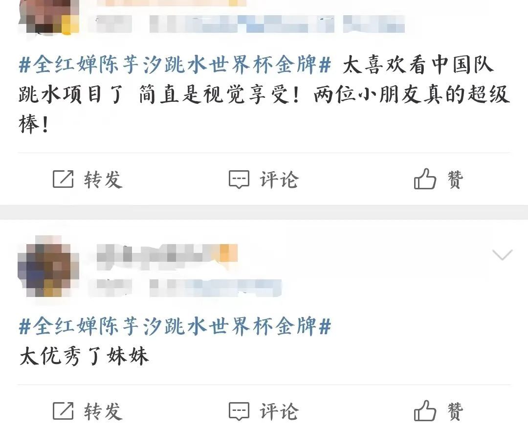 作为当下中国跳水队的王牌组合,全红婵、陈芋汐在比赛中可以说是遥遥领先。每一跳两人都配合默契,非常一致地完成了动作,“水花消失术”再次惊叹所有人。最终,两人以领先第二名60分的差距拿下冠军。不少观赛的网友也是连连称赞,送上诚挚的祝贺。