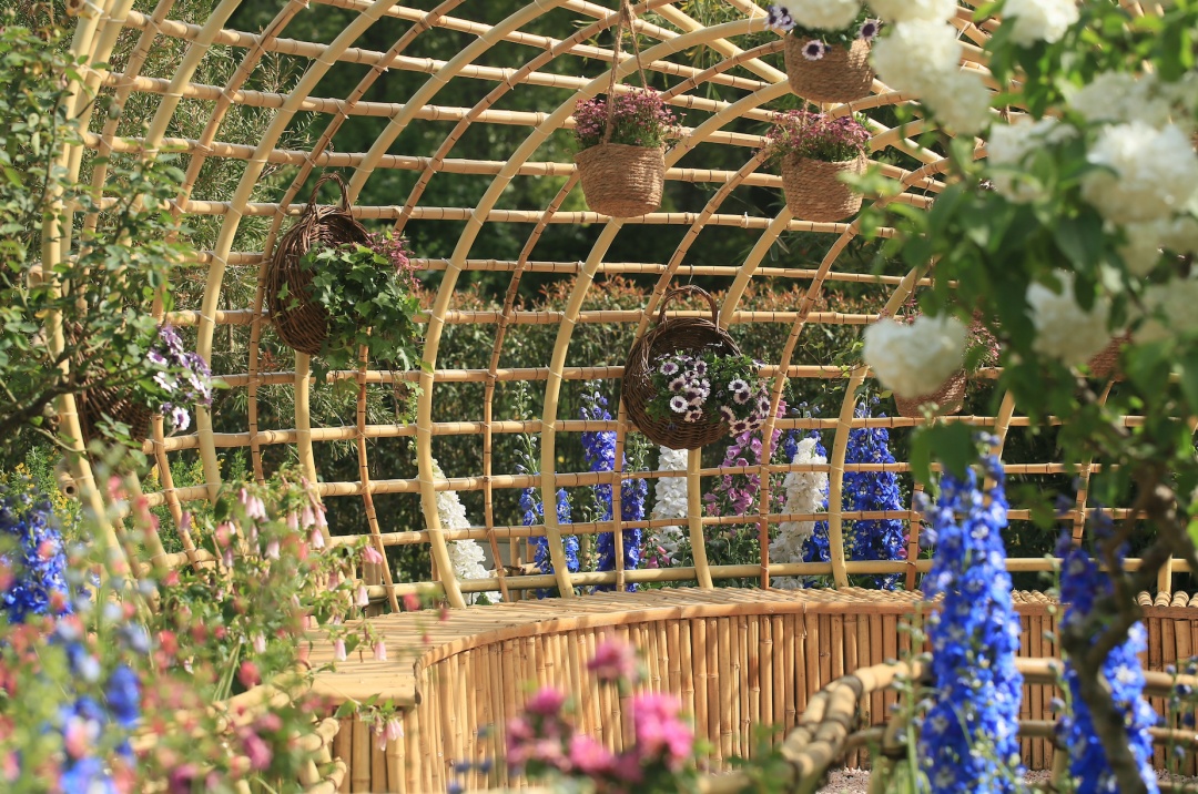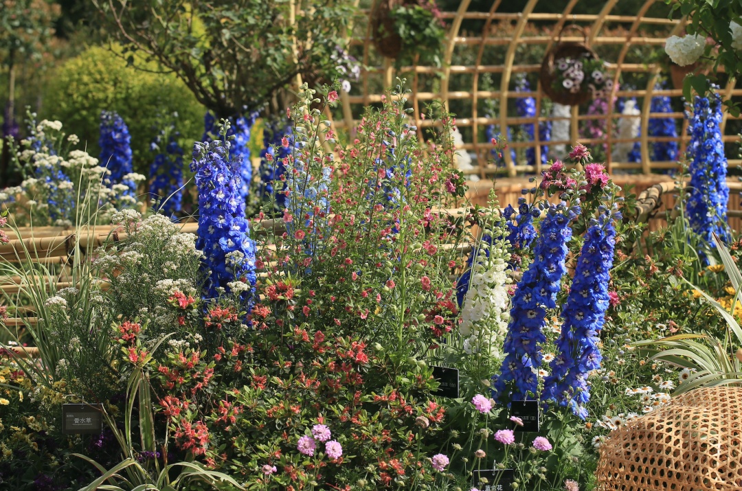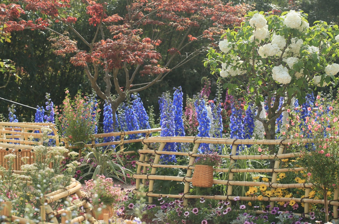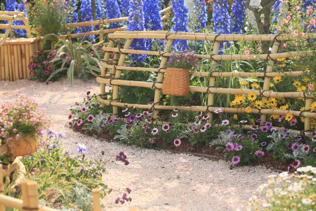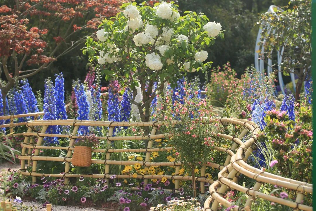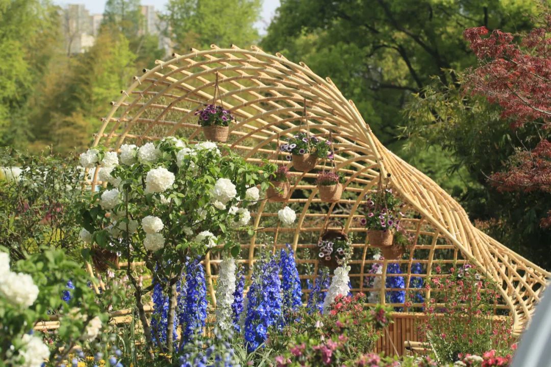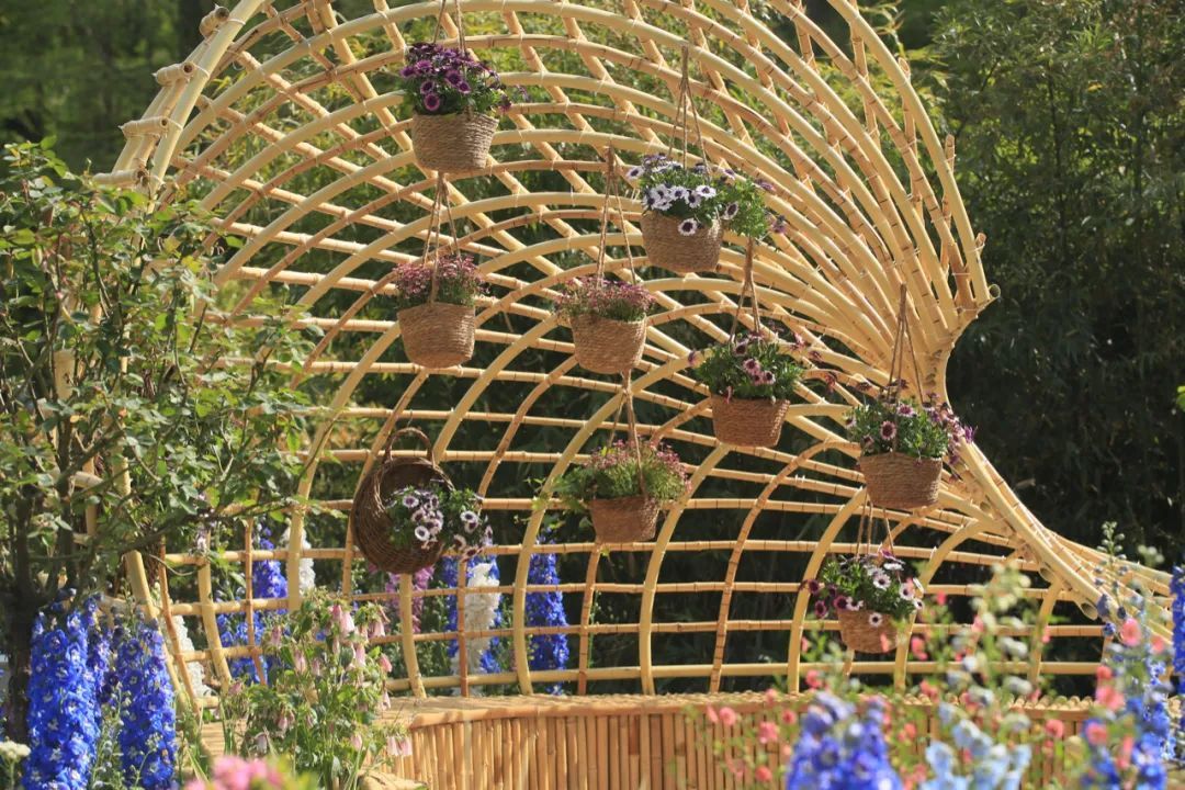 “梦海沉吟”为景观序列高潮,蜗牛状竹编构筑被一片粉紫色调的花海所环绕,以多种杜鹃花和优雅唯美的大花飞燕草,编织了一个绚烂悠长的梦;
