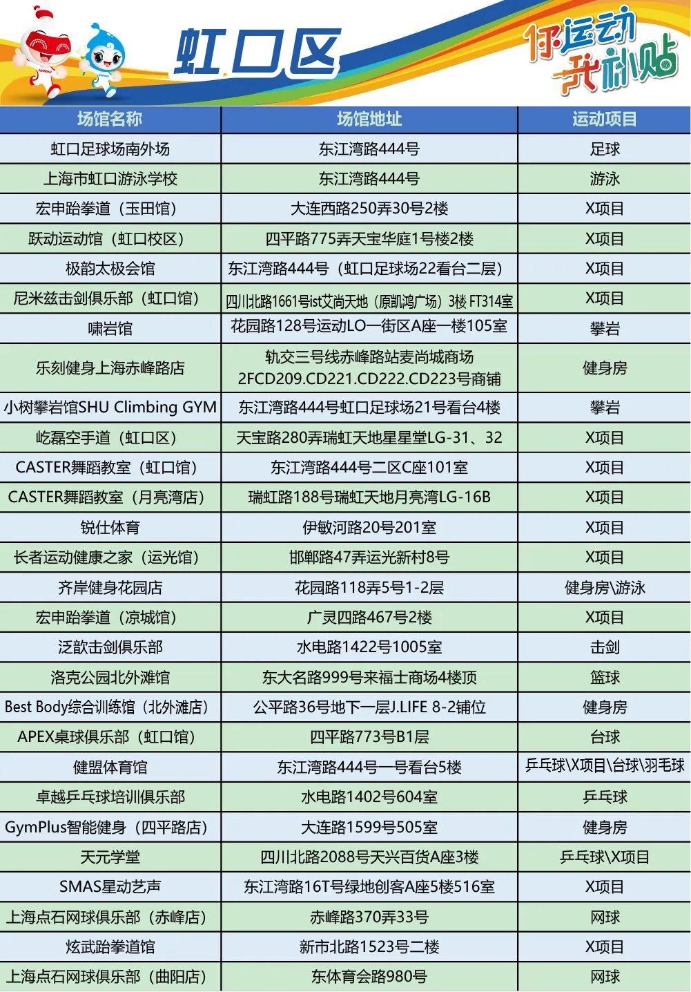 截至目前,虹口区已有28家体育消费券定点场馆,包含足球、游泳、健身、攀岩、乒乓球等多种项目!详情请见下表↓↓↓