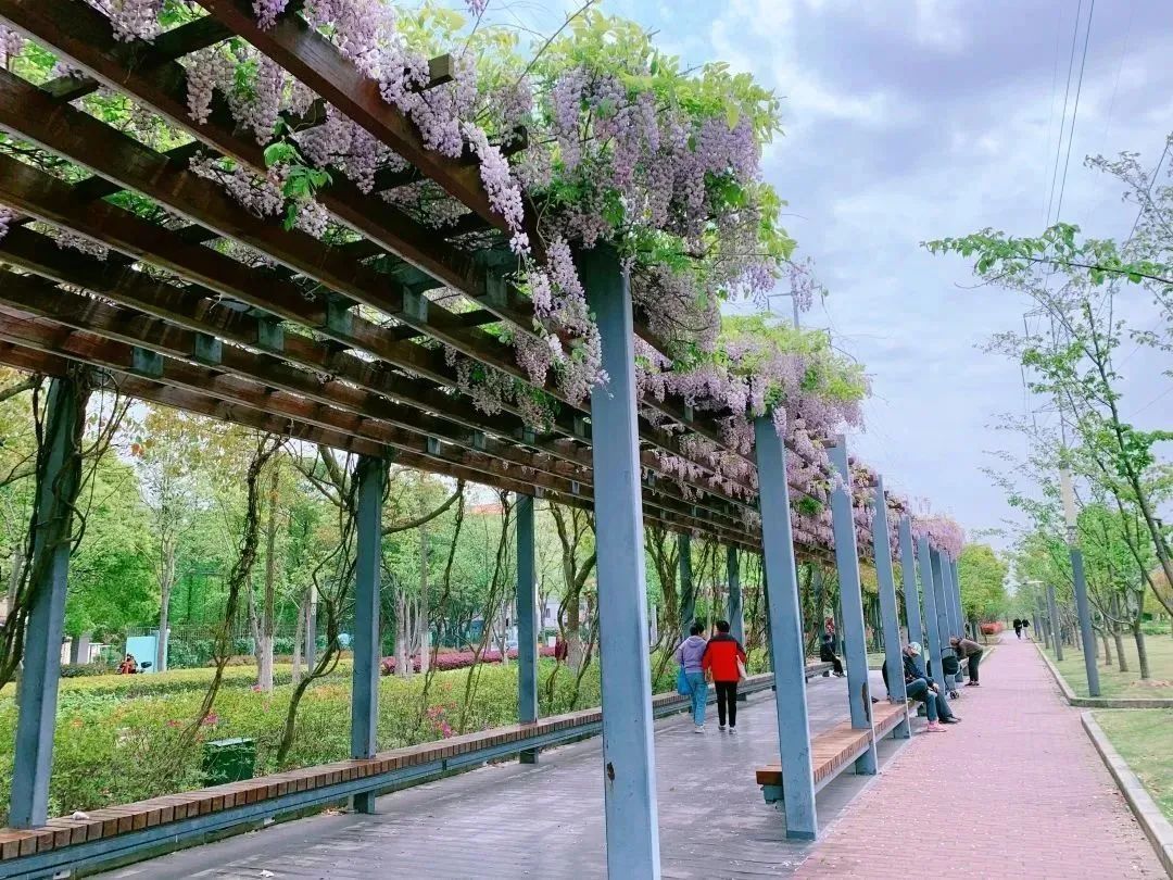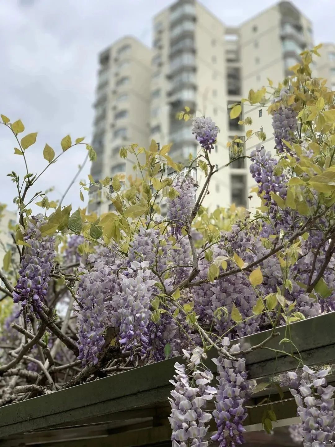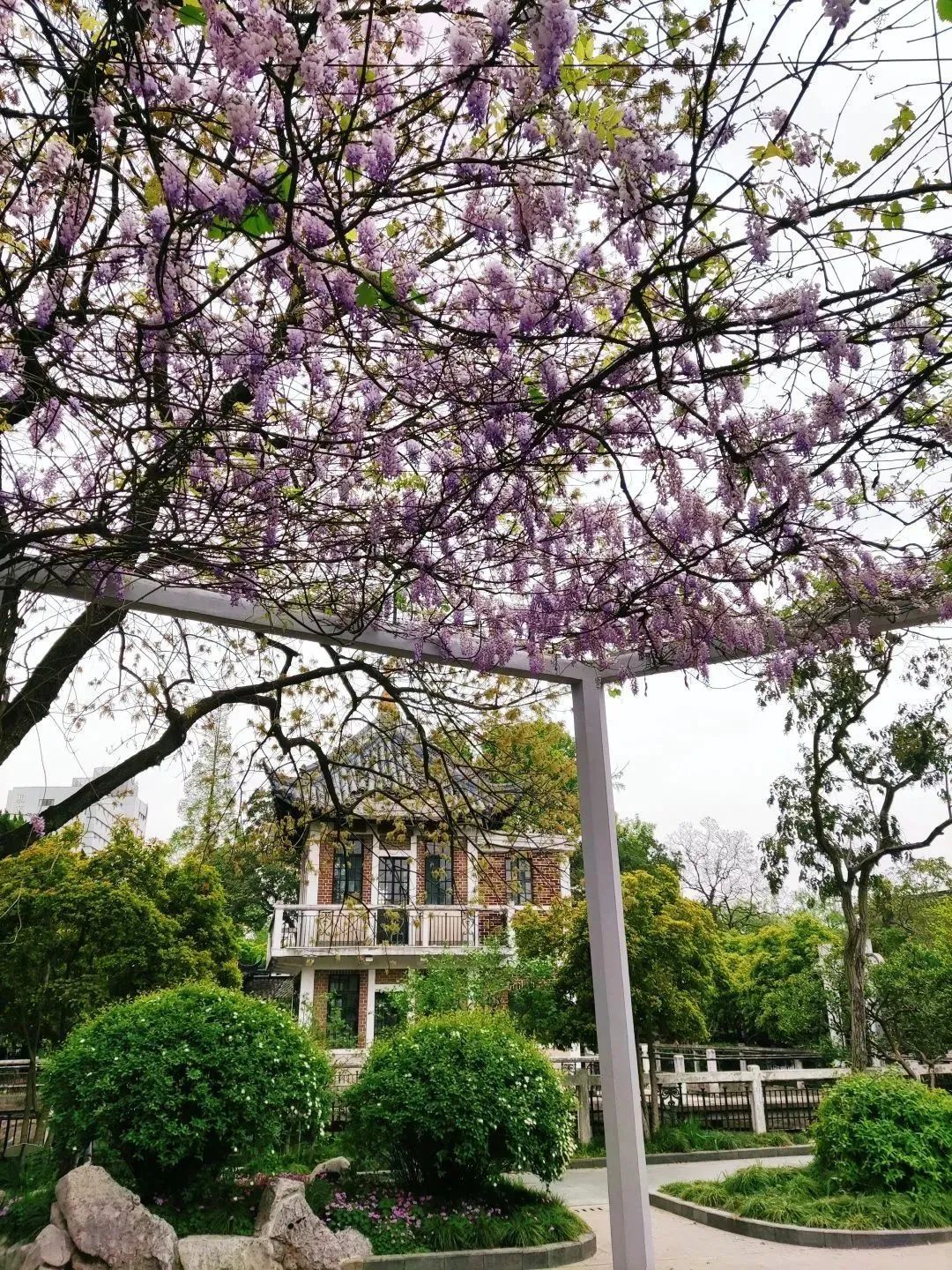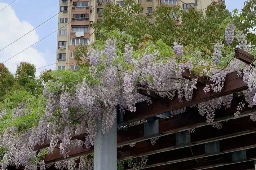 从桂林公园漕宝路大门进入,颐亭旁的一角,蔓蔓紫藤花已悄然绽放,吐露芬芳。在这座满园苍翠、粉墙黛瓦的公园里,串串紫藤花将这里装扮得格外靓丽,增添了一份生机与活力,是悠悠四月天的最美存在。