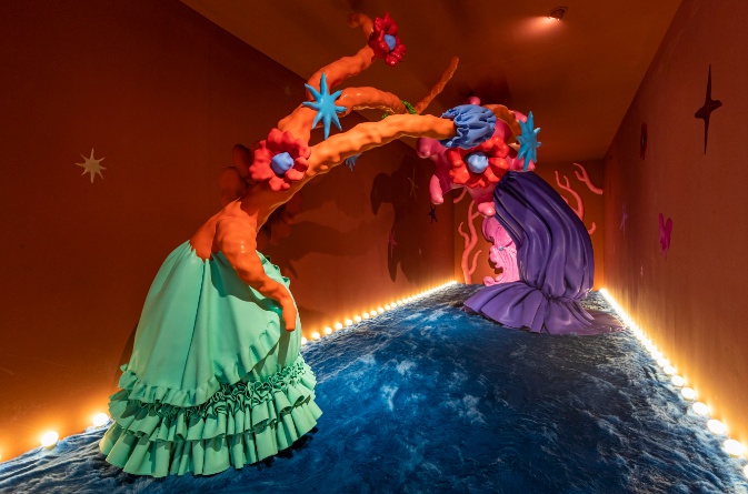 该艺术装置从被刻意放大尺寸的怪诞日常,到陨石内部的甬道,让感观者想起科幻小说中的主角形象,而这段旅程不止于此,主角的眼睛在穿越时空之门后回望着观者,达到旅途高潮,其生动形象于脑海中久久萦绕。