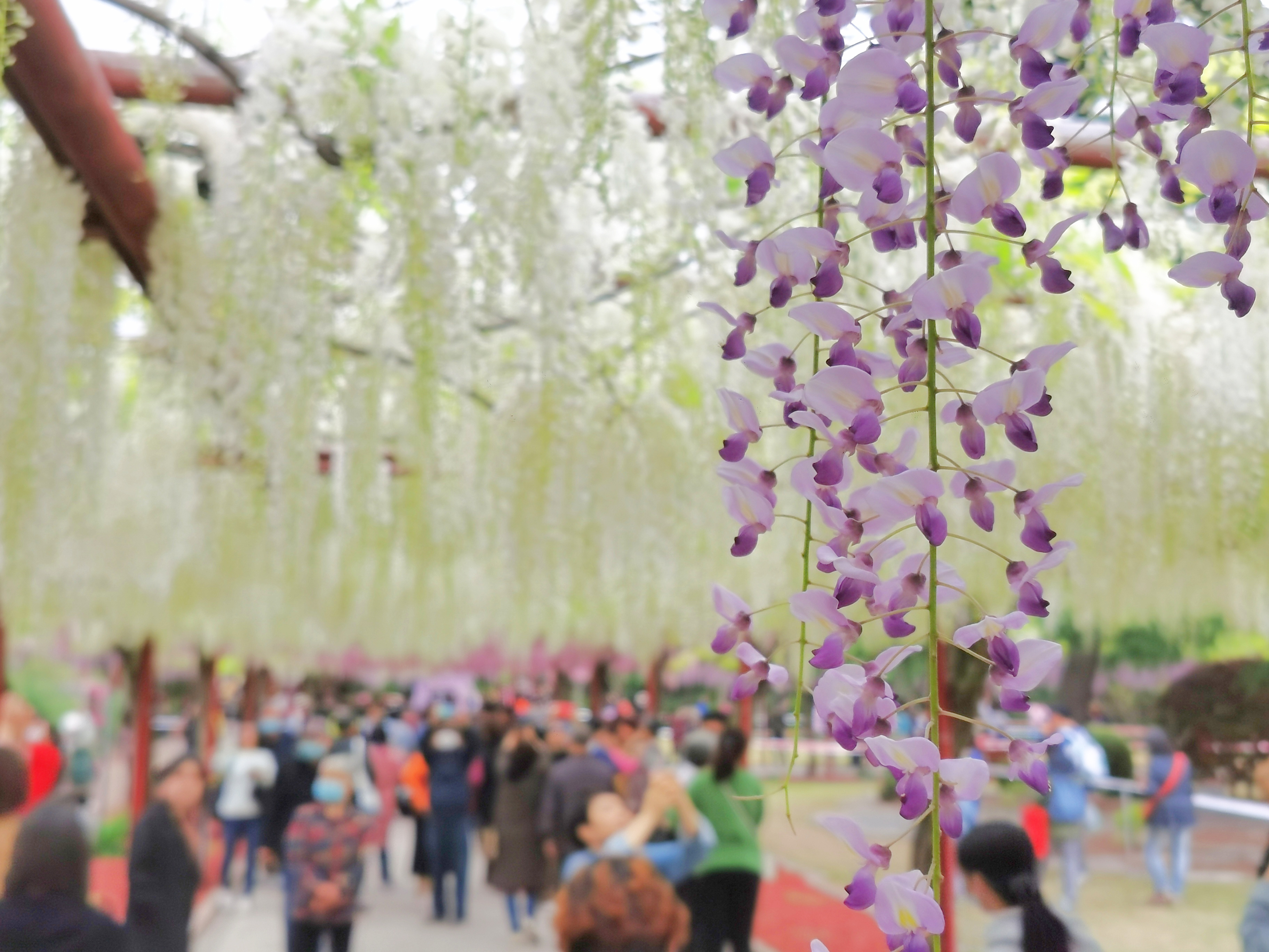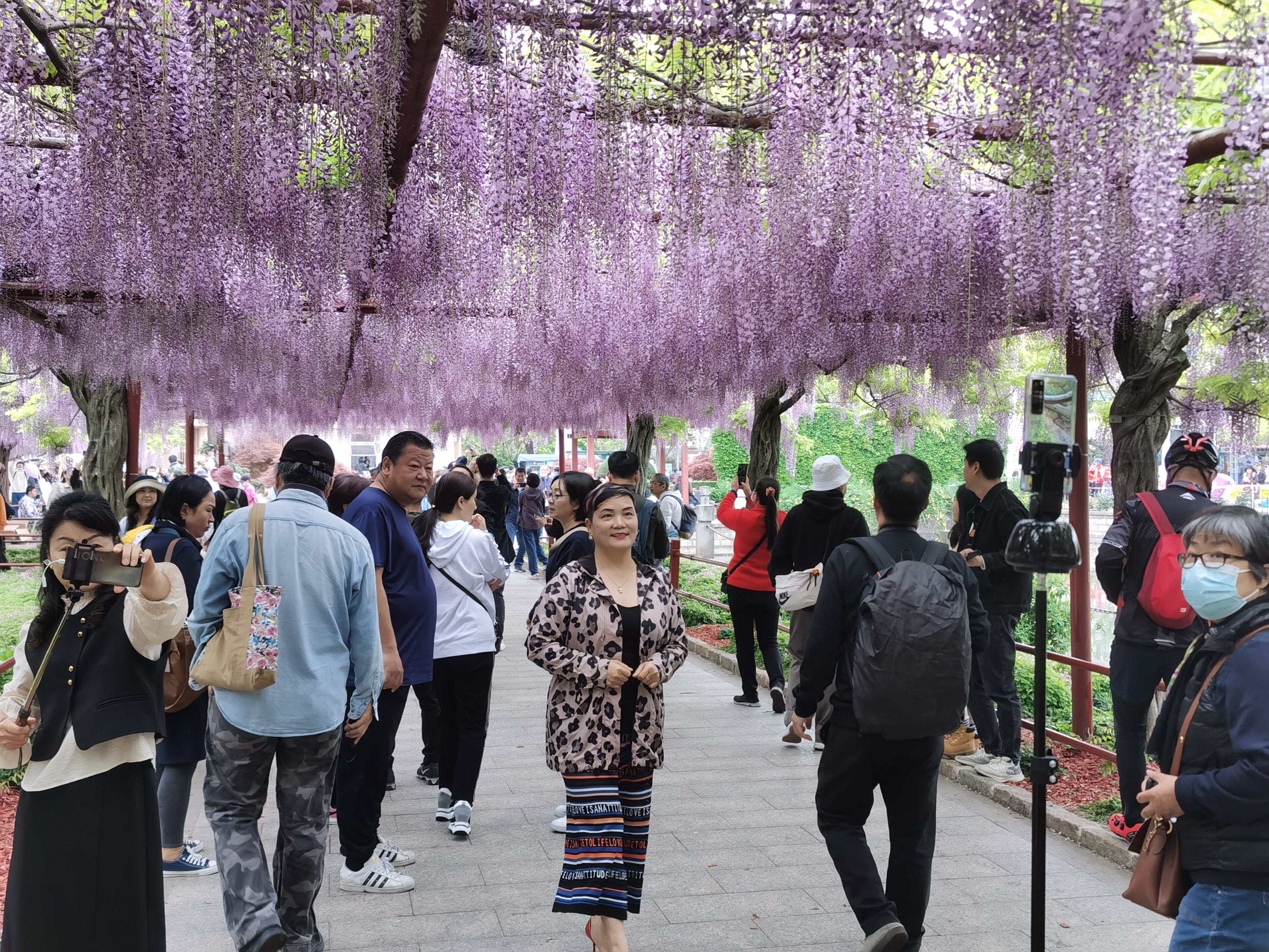 “我们想错开高峰,早上8点就出门了,没想到这里已经这么多人了。”游客朱女士说,“紫藤花真的很漂亮,远远看过去朦朦胧胧,像彩色棉花糖。”
