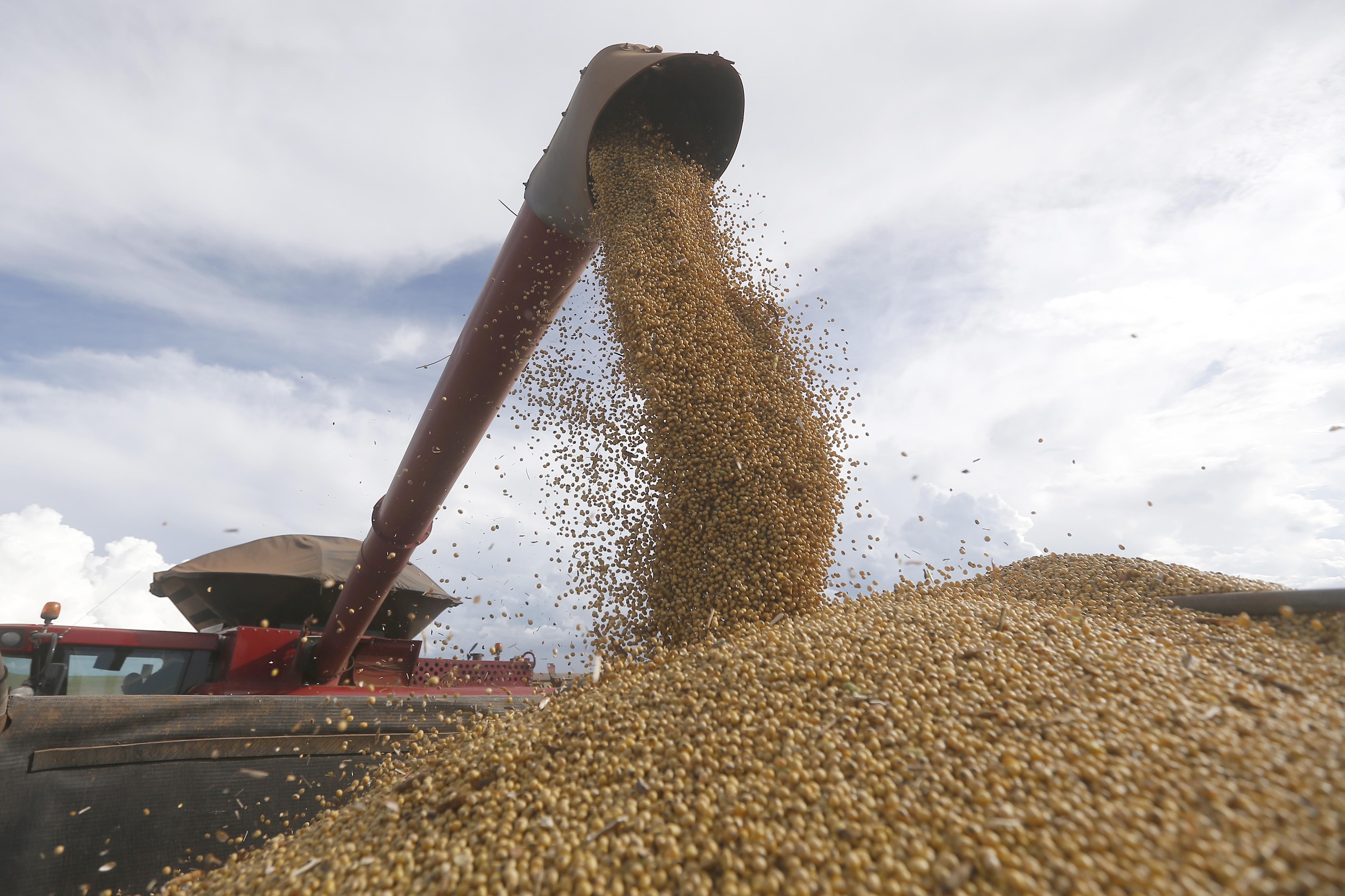 (4月12日,在巴西戈亚斯州班德里尼亚农场,农机进行收获大豆作业。