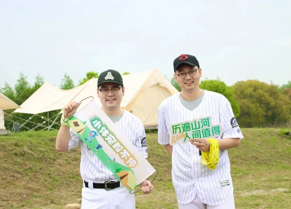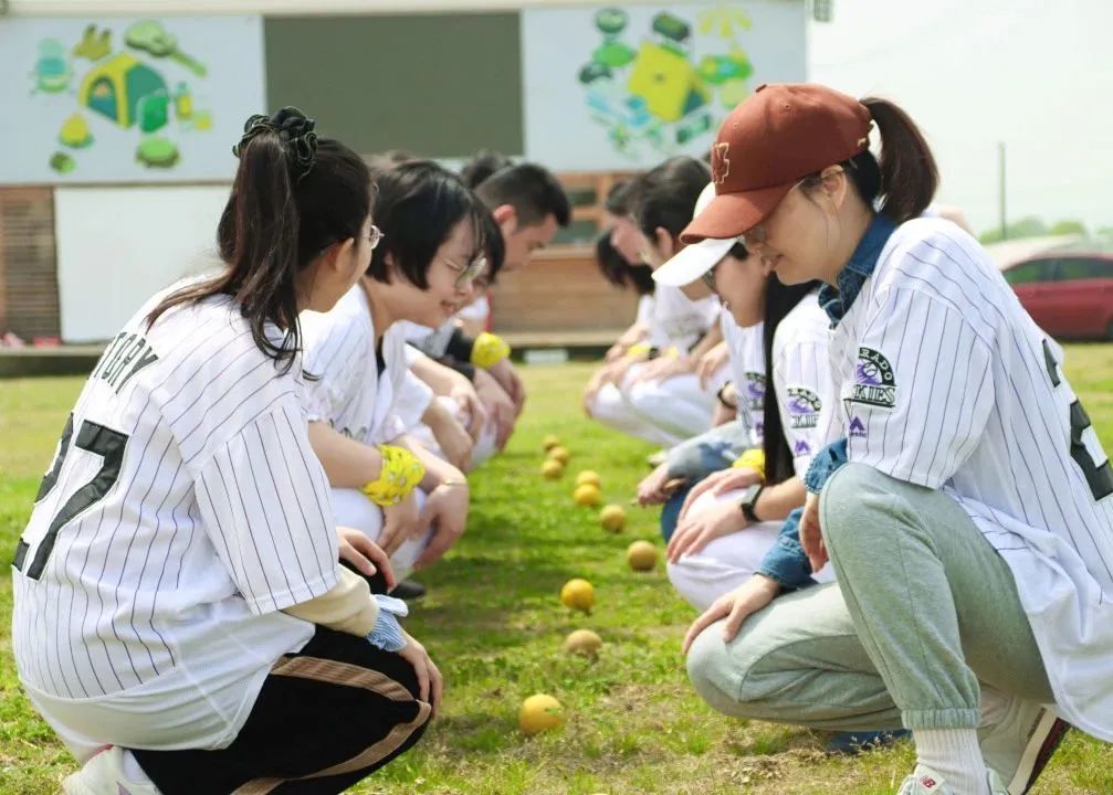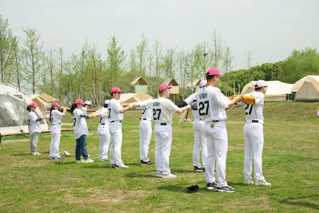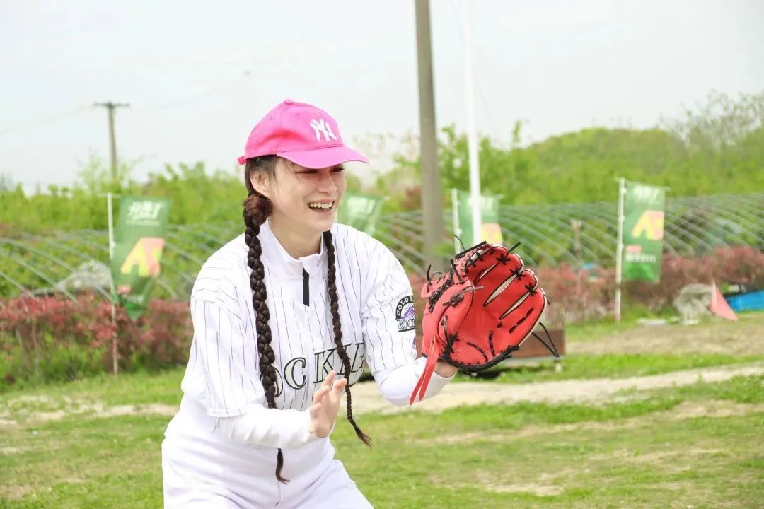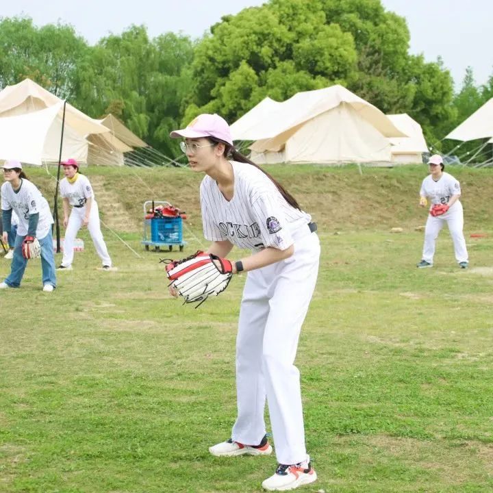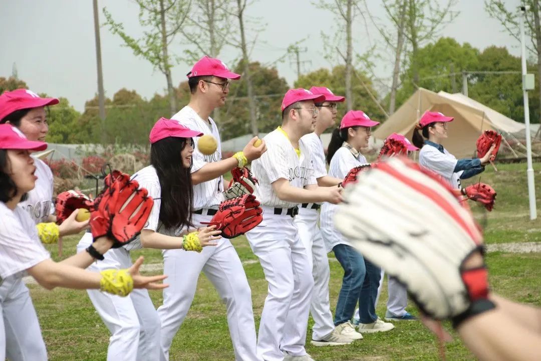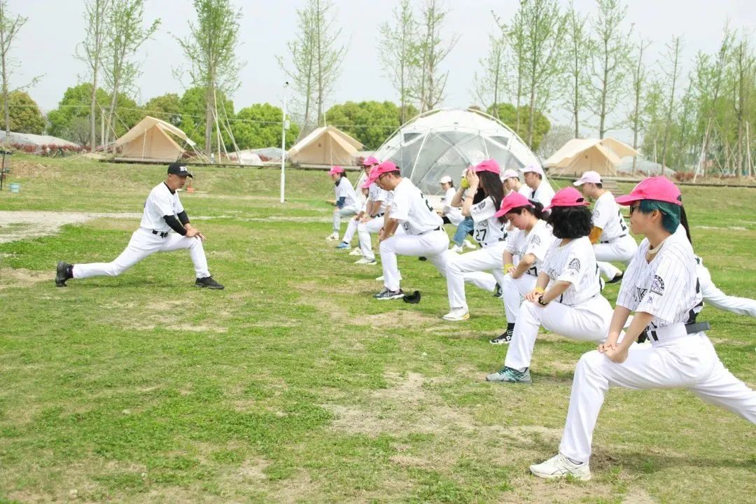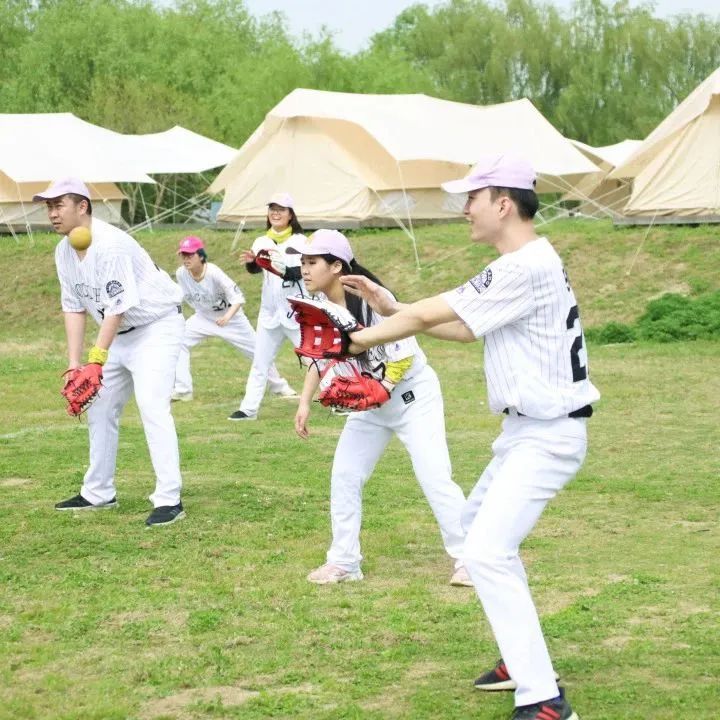 四月的营地里绿草茵茵,参与活动的小伙伴各自换好专业统一的棒球服装,手持卡片拍照留念。随后,教练带领大家进行了分组小游戏,按照帽子的颜色和男女比例分为玫红和浅紫两个小队在下午进行棒球对抗赛活动。