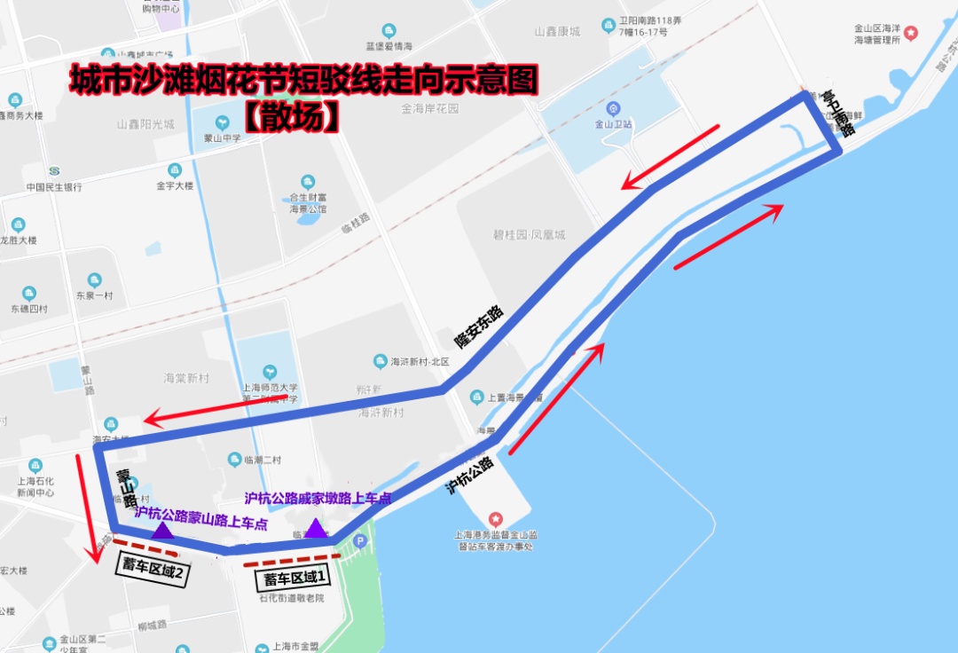 路线二:S19高速——金山卫出口——新卫公路——金山大道——杭州湾大道——金山城市沙滩