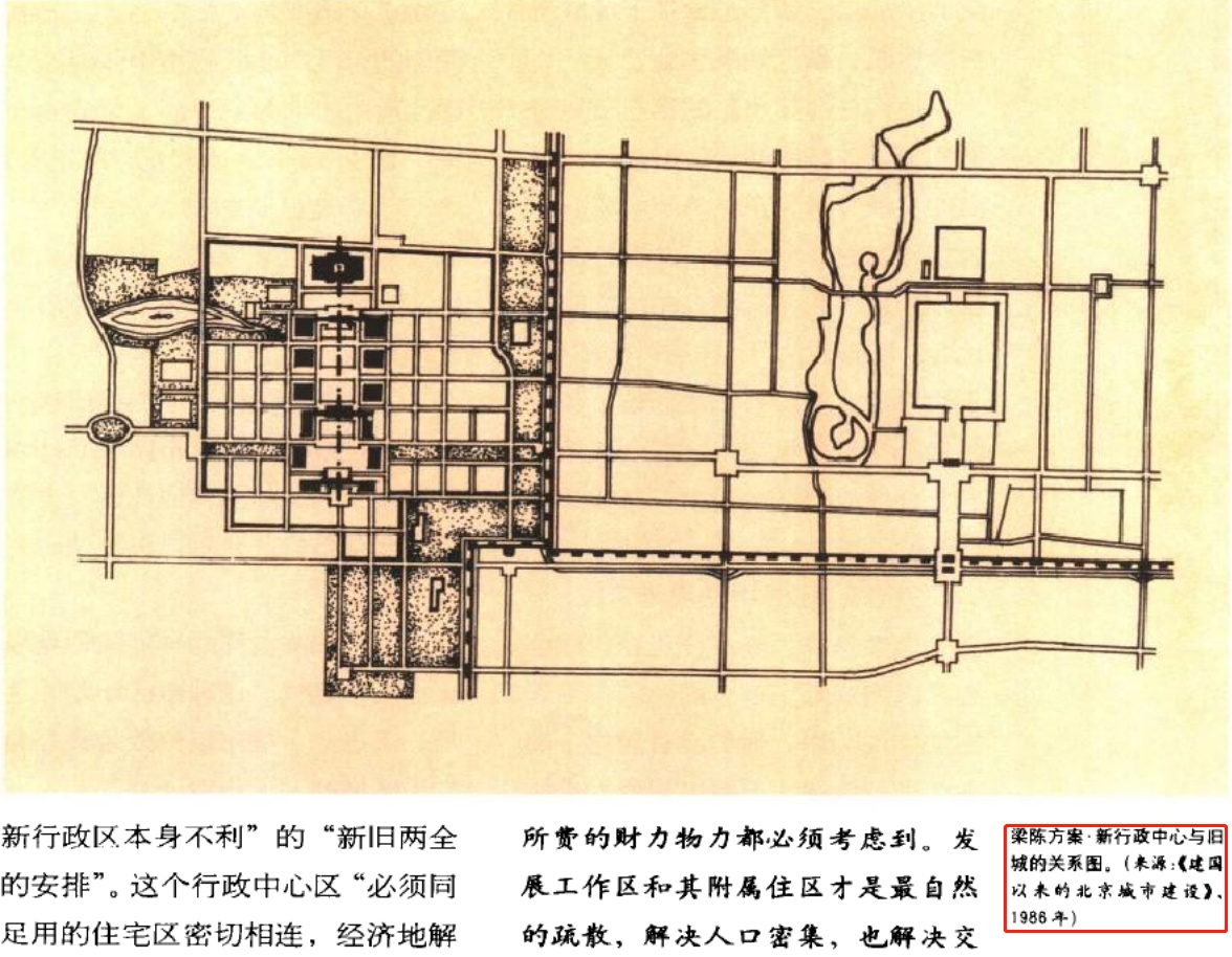 “梁陈方案”提出,将新中国行政中心搬出老城,建在西边,同时以行政中心区以南,规划一个商务区。按照他们的设想实施,北京将拥有三个相互联系又功能区分的中心区域,旧城是文物遗存丰厚的文化中心区,旧城西侧的行政中心区将集中体现新中国政治中心的形象,而其南侧的商务中心区将是一派现代都市的景象。这三个功能区将配套足用的住宅,以最大限度地减少跨区域交通的发生,从而控制住“源头”,避免交通拥堵。
