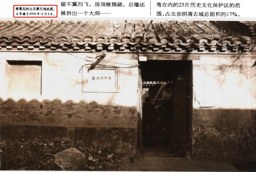 将时光拉回20多年前,北京市东城区东堂子胡同75号蔡元培故居险遭拆除。2000年11月23日,蔡元培故居紧靠胡同的一侧,数间房屋被严重拆损,屋顶没了,院壁一片残痕,院内几间房屋也被捅破了顶,大门两侧,被刷上两个大大的“拆”字,而刻有“北京市东城区文物保护单位蔡元培故居”字样的石碑还在墙上。
