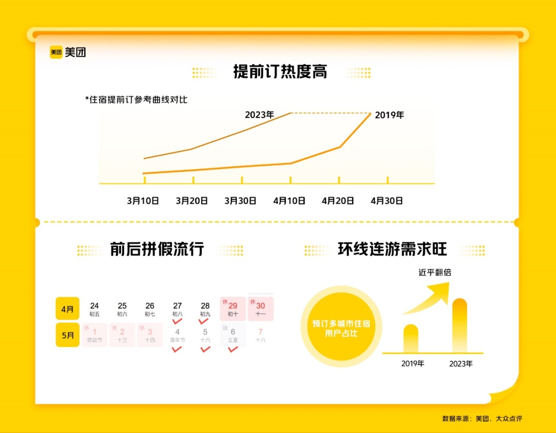 此外,一些新趋势也在发生。一是前后拼假流行,美团数据显示,在法定假期之外,4月27日和5月6日,也将迎来两个入住小波峰;二是环线连游需求旺,消费者大多会游玩多个城市,以获取丰富、深度的假期体验,热门环线上的城市住宿量迎来同步上涨,美团上预订2个以上城市住宿的用户占比较2019年近乎翻倍。