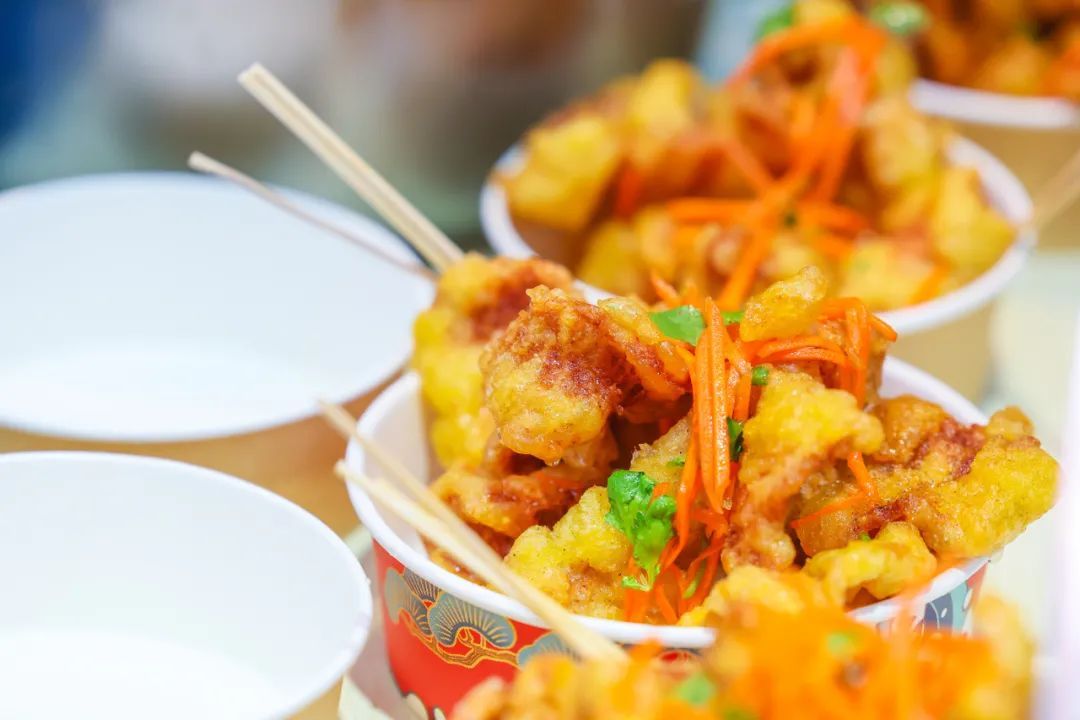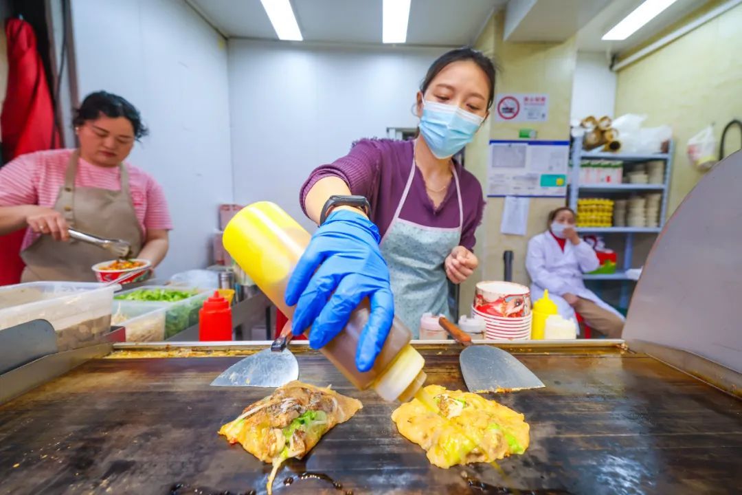 在琳琅满目的摊位中,一名身穿东北大花布衣服的男摊主着实引人注目。只见他把锅包肉往油锅里一放,瞬间嗞嗞作响,炸得酥脆后出锅,再淋上一层酸甜酱汁,看得人直流哈喇子。“给我来一份!”就读于松江大学城的尹同学径直走来点了一份锅包肉,她说来之前特地在“小红书”App上浏览了其他食客发布的攻略,“别人推荐的‘必吃榜’我是一定要打卡品尝的”。