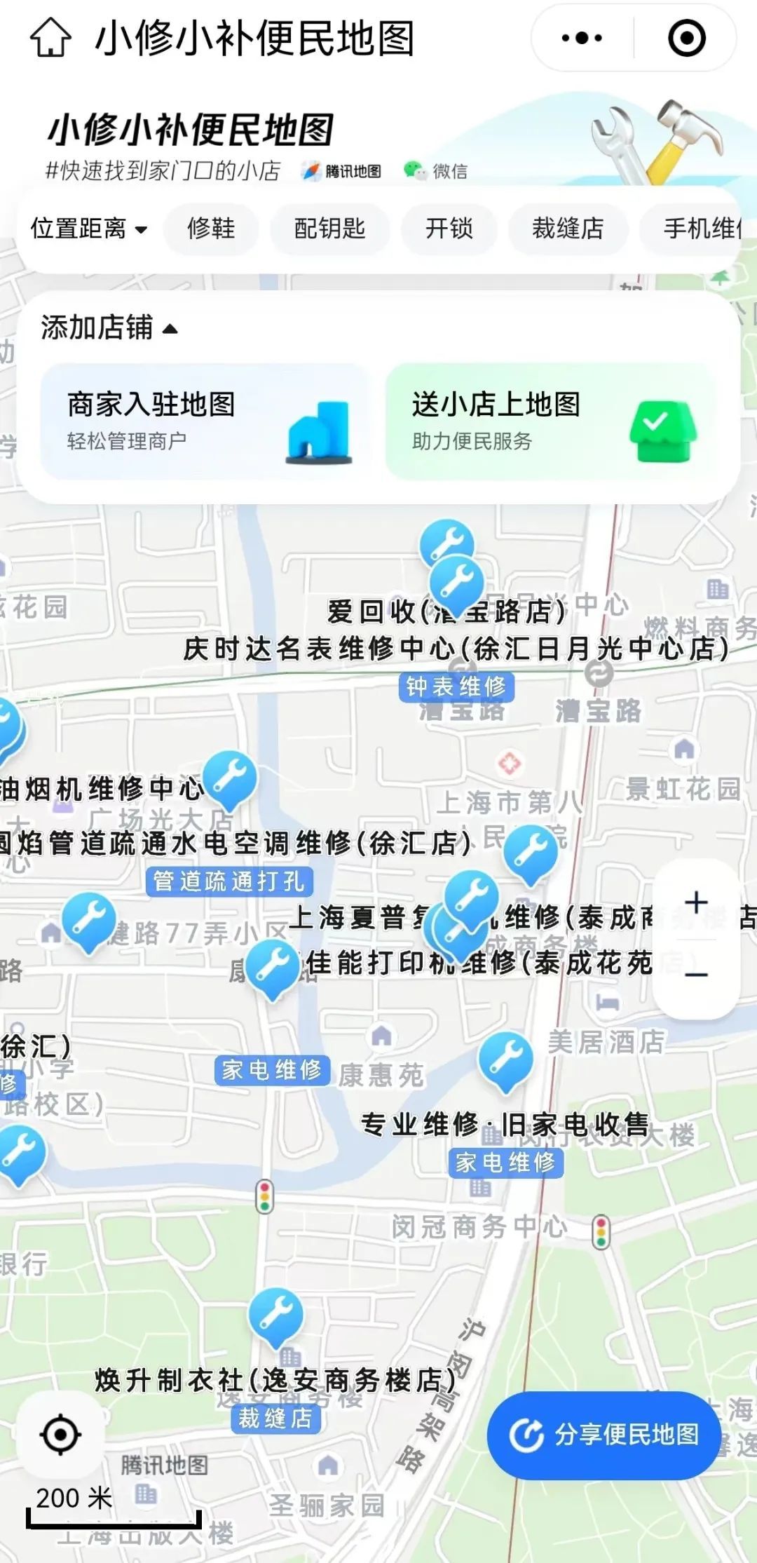 只要在微信搜一搜或腾讯地图App搜索关键词“小修小补”,即可进入“便民修补小店地图”,快速找到家门口的“小修小补”点位,查看地理位置、门面照片、营业时间、联系电话等,并可一键导航。