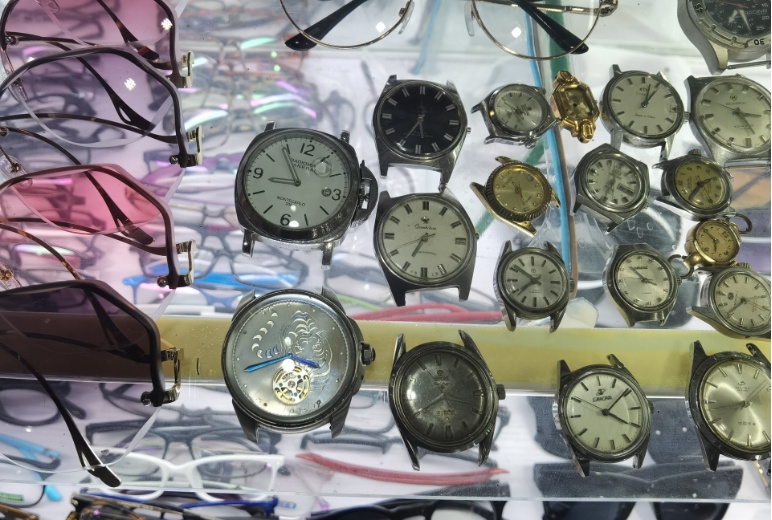 钟表和眼镜占据着铺位的C位。“这里很多都是几十年的老表,有人拿来修,发现里面已经锈死了。”老板施永辉把这些表清理干净,也摆在了老式玻璃柜中。这些怀表、手表曾兢兢业业地记录时间,随着一代上海人成长老去,如今,它们终于安静下来,任由时光淹没。